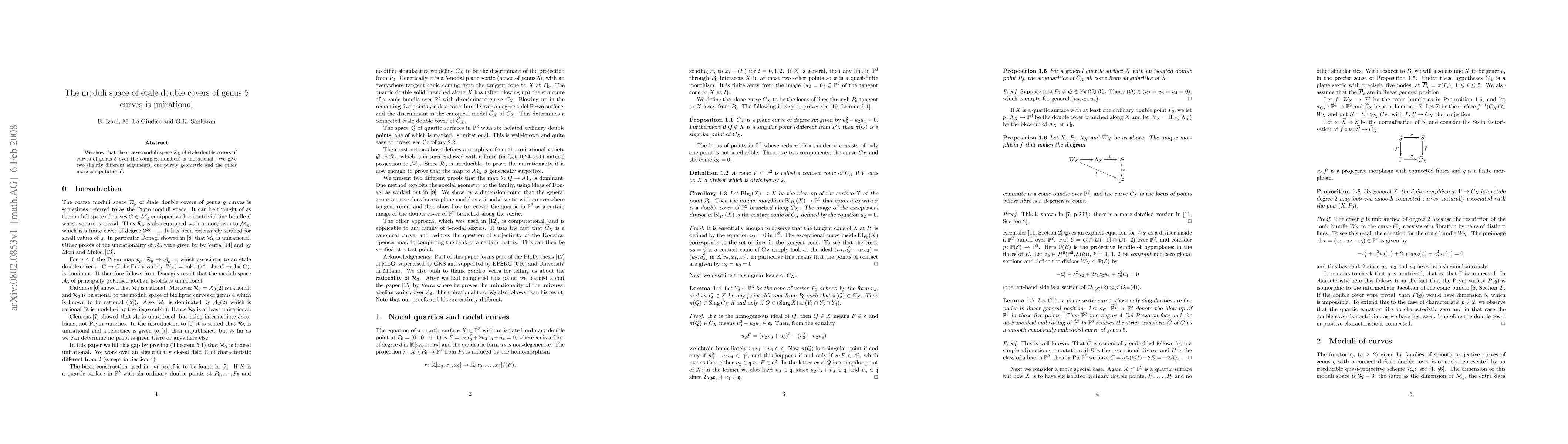 We show that the coarse moduli space $\cR_5$ of \'etale double covers of curves of genus~5 over the complex numbers is unirational. We give two slightly different arguments, one purely geometric and the other more computational.