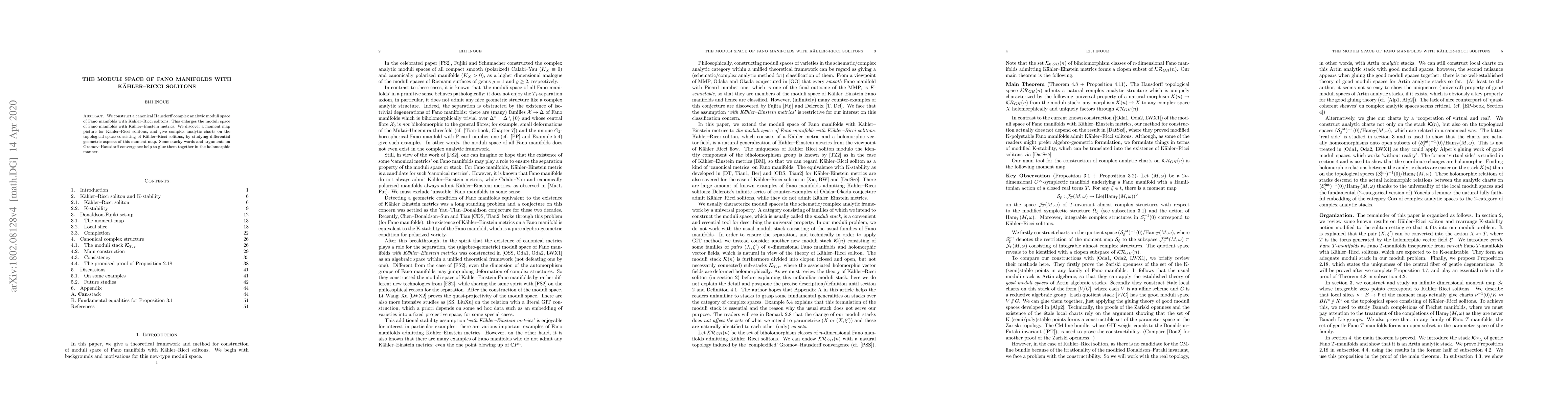 We construct a canonical Hausdorff complex analytic moduli space of Fano manifolds with K\"ahler-Ricci solitons. This naturally enlarges the moduli space of Fano manifolds with K\"ahler-Einstein metrics, which was constructed by Odaka and Li-Wang-Xu. We discover a moment map picture for K\"ahler-Ricci solitons, and give complex analytic charts on the topological space consisting of K\"ahler-Ricci solitons, by studying differential geometric aspects of this infinite dimensional moment map. Some stacky words and arguments on Gromov-Hausdorff convergence help to glue them together in the holomorphic manner.