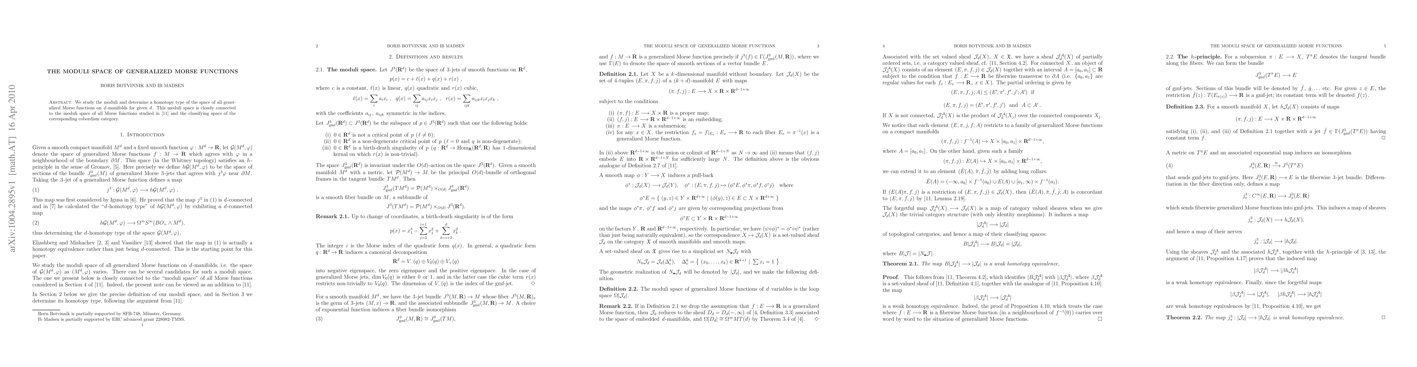 The paper explores the moduli space of generalized Morse functions on d-manifolds, determining its homotopy type and its connection to the moduli space of classical Morse functions, along with its relationship to the classifying space of the cobordism category.