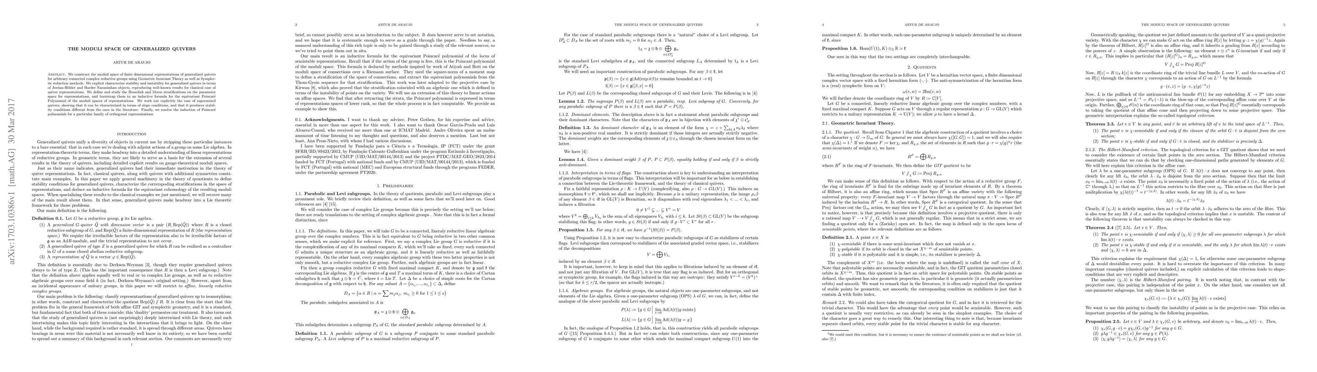 This paper constructs the moduli space for representations of generalized quivers using Geometric Invariant Theory and Symplectic reduction, and defines stability conditions. It also introduces Hesselink and Morse stratifications and resolves the induction of Poincaré polynomials for specific orthogonal representations.