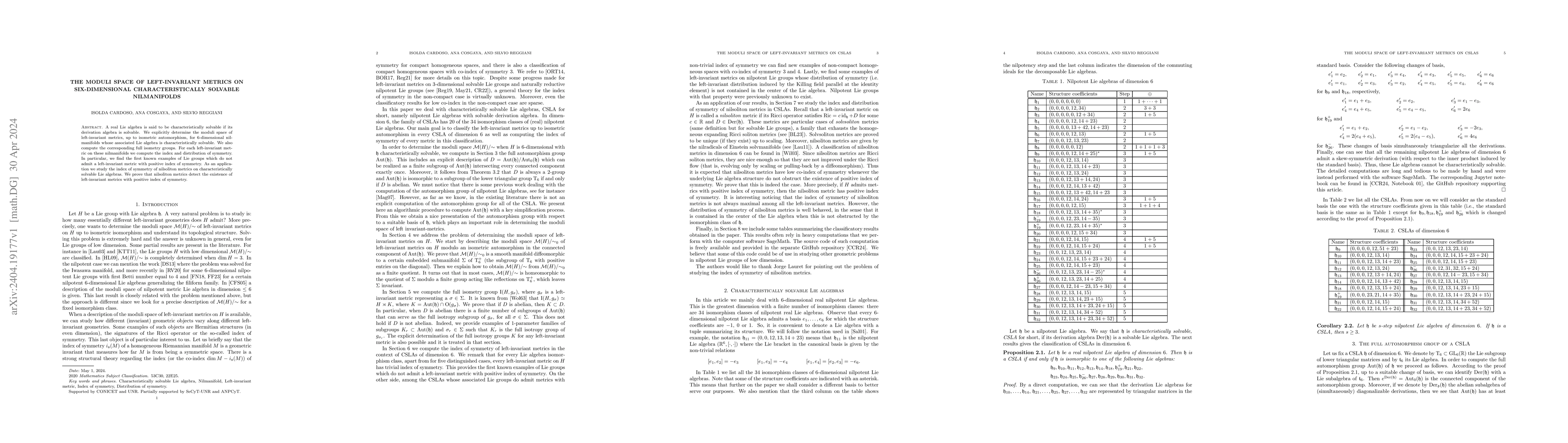 This paper identifies the moduli space of left-invariant metrics on six-dimensional characteristically solvable nilmanifolds, computing their isometry groups and symmetry indices, and reveals the first Lie groups lacking metrics with a positive index of symmetry. It also shows that nilsoliton metrics can detect such metrics with positive symmetry index.
