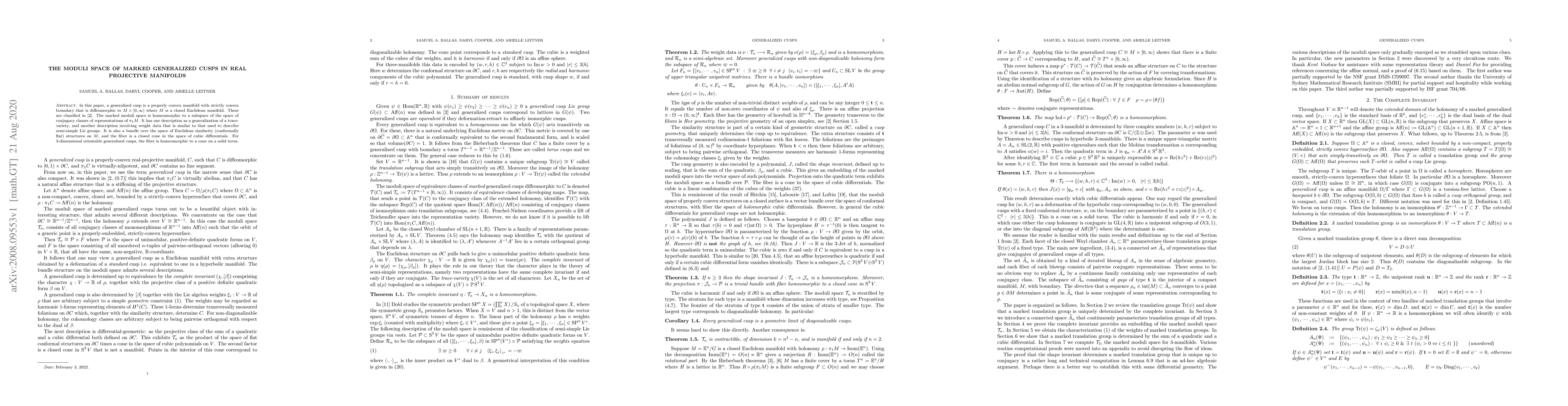 This paper explores generalized cusps in real projective manifolds, defining them as properly convex manifolds with strictly convex boundaries diffeomorphic to M×[0, ∞). The marked moduli space of these cusps is shown to be homeomorphic to a subspace of conjugacy classes of representations of π₁(M). It's described as a generalization of a trace-variety and involves weight data similar to semi-simple Lie groups. The moduli space is also presented as a bundle over Euclidean similarity structures on M, with a cubic differential space cone as the fiber. For 3D orientable generalized cusps, the fiber is homeomorphic to a cone on a solid torus.