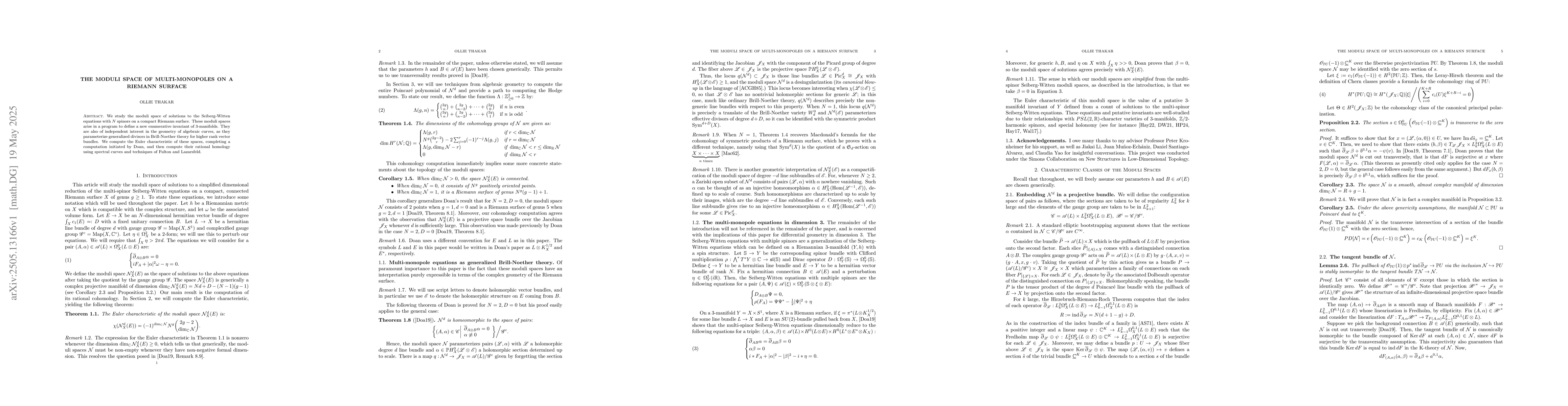 The research employs the Seiberg-Witten equations with N spinors on a compact Riemann surface, utilizing spectral curves and techniques from Fulton and Lazarsfeld to compute the moduli space's Euler characteristic and rational homology.