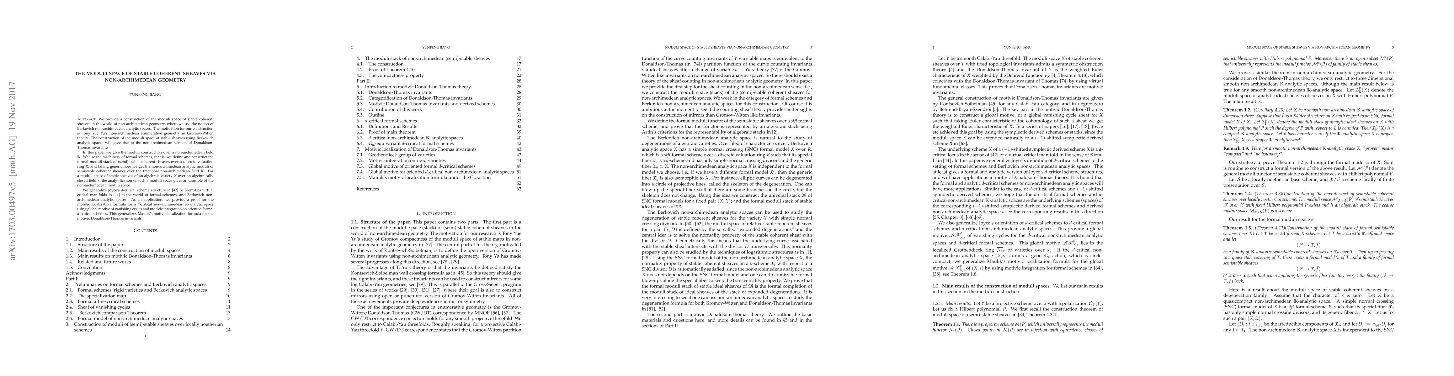 This paper constructs the moduli space of stable coherent sheaves using non-archimedean geometry and Berkovich spaces, motivated by Yu's enumerative geometry. It introduces a formal moduli stack for (semi)-stable coherent sheaves and proves a motivic localization formula for $d$-critical non-archimedean analytic spaces.