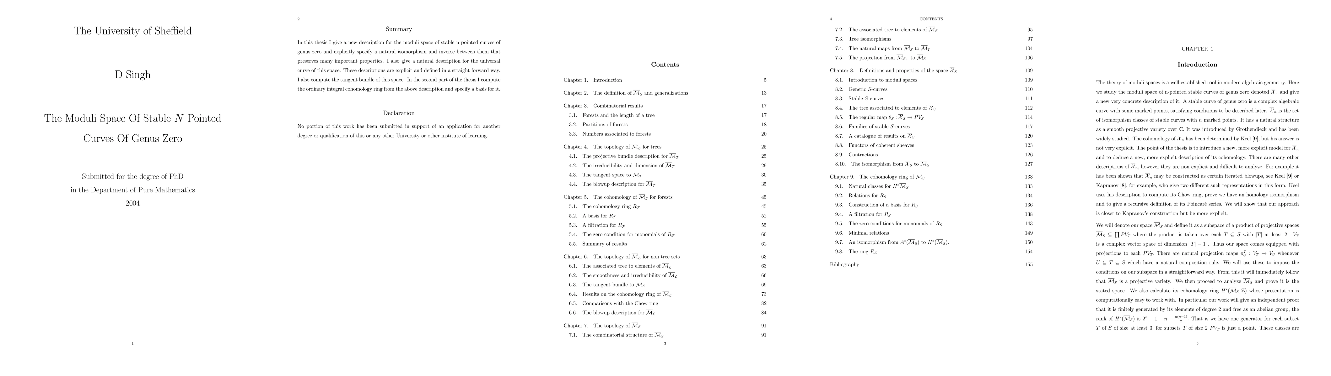 In this thesis I give a new description for the moduli space of stable n pointed curves of genus zero and explicitly specify a natural isomorphism and inverse between them that preserves many important properties. I also give a natural description for the universal curve of this space. These descriptions are explicit and defined in a straight forward way. I also compute the tangent bundle of this space. In the second part of the thesis I compute the ordinary integral cohomology ring from the above description and specify a basis for it.