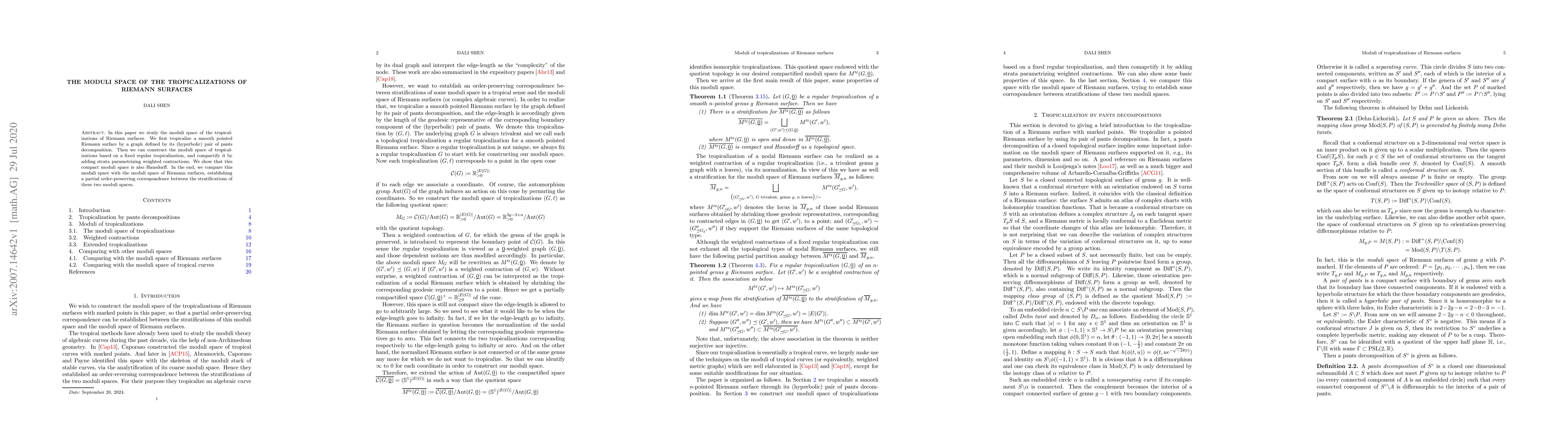 This paper investigates the moduli space of tropicalizations of Riemann surfaces, establishing a compact Hausdorff moduli space through a fixed regular tropicalization and weighted contractions. It also draws a partial order-preserving correspondence between the stratifications of this moduli space and the moduli space of Riemann surfaces.