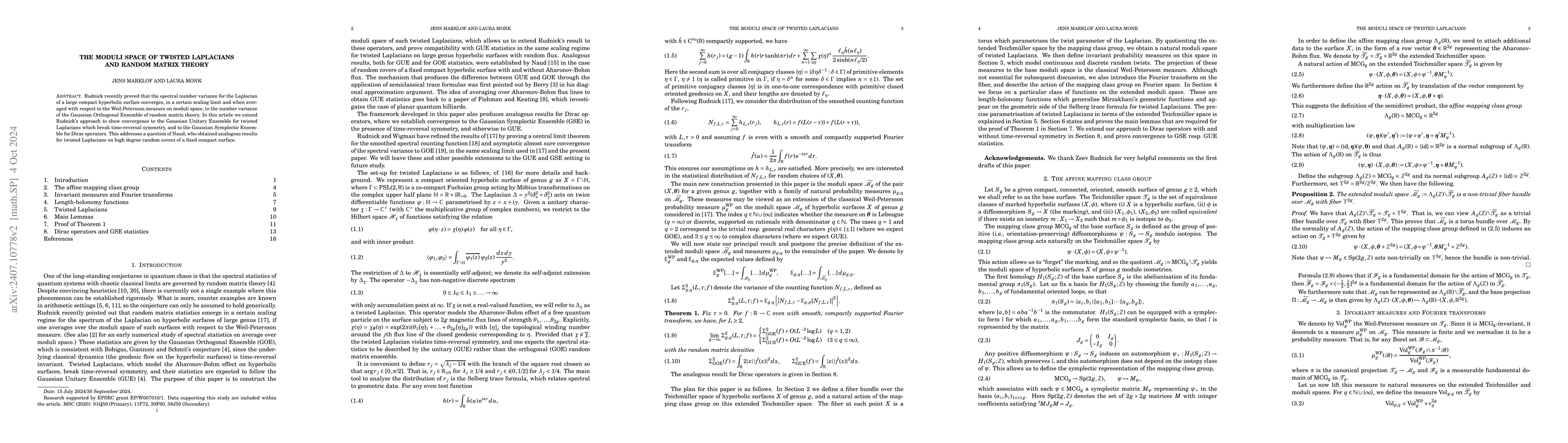 Rudnick recently proved that the spectral number variance for the Laplacian of a large compact hyperbolic surface converges, in a certain scaling limit and when averaged with respect to the Weil-Petersson measure on moduli space, to the number variance of the Gaussian Orthogonal Ensemble of random matrix theory. In this article we extend Rudnick's approach to show convergence to the Gaussian Unitary Ensemble for twisted Laplacians which break time-reversal symmetry, and to the Gaussian Symplectic Ensemble for Dirac operators. This addresses a question of Naud, who obtained analogous results for twisted Laplacians on high degree random covers of a fixed compact surface.