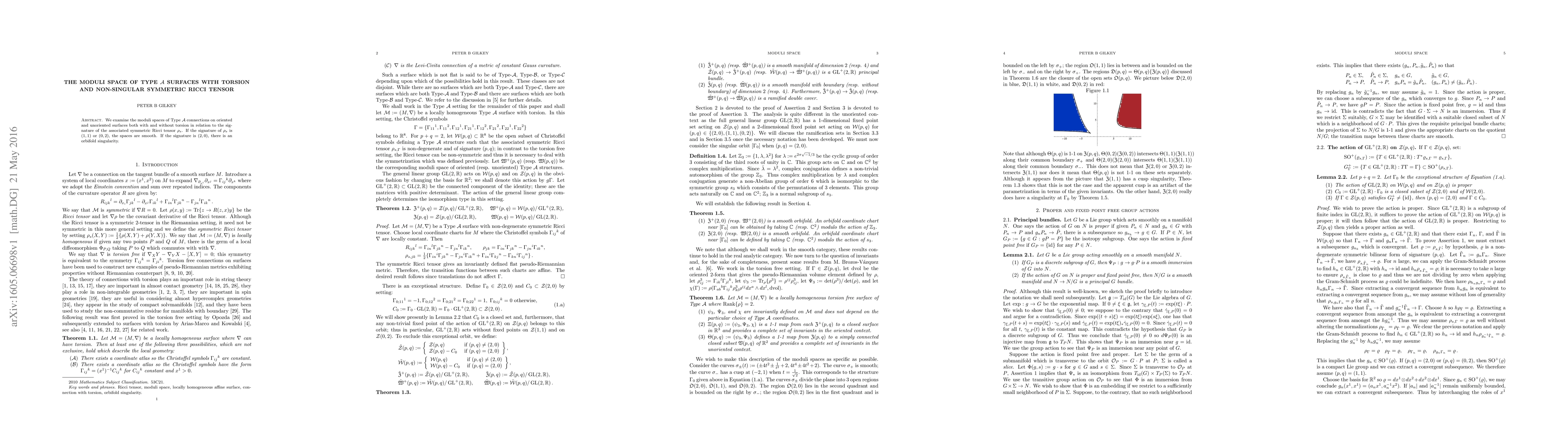 Summary: This research explores the moduli spaces of Type~A connections on surfaces concerning the symmetric Ricci tensor's signature. Smooth moduli spaces occur when the signature is (1,1) or (0,2), while an orbifold singularity appears for a (2,0) signature.