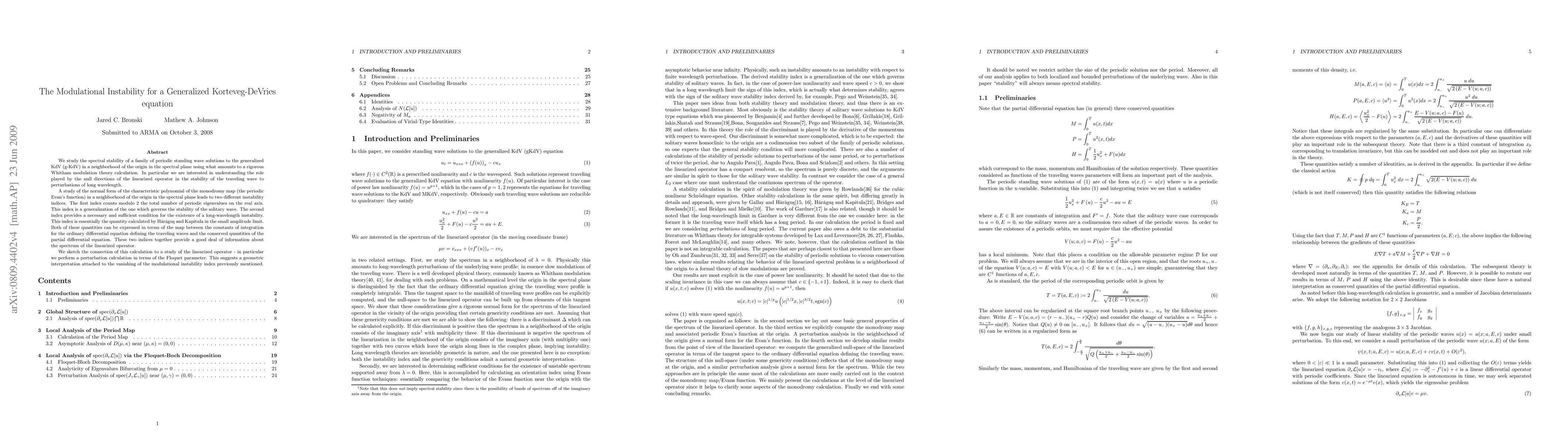 We study the spectral stability of a family of periodic standing wave solutions to the generalized KdV (g-KdV) in a neighborhood of the origin in the spectral plane using what amounts to a rigorous Whitham modulation theory calculation. In particular we are interested in understanding the role played by the null directions of the linearized operator in the stability of the traveling wave to perturbations of long wavelength. A study of the normal form of the characteristic polynomial of the monodromy map (the periodic Evan's function) in a neighborhood of the origin in the spectral plane leads to two different instability indices. The first index counts modulo 2 the total number of periodic eigenvalues on the real axis. This index is a generalization of the one which governs the stability of the solitary wave. The second index provides a necessary and sufficient condition for the existence of a long-wavelength instability. This index is essentially the quantity calculated by Haragus and Kapitula in the small amplitude limit. Both of these quantities can be expressed in terms of the map between the constants of integration for the ordinary differential equation defining the traveling waves and the conserved quantities of the partial differential equation. These two indices together provide a good deal of information about the spectrum of the linearized operator. We sketch the connection of this calculation to a study of the linearized operator - in particular we perform a perturbation calculation in terms of the Floquet parameter. This suggests geometric interpretations attached to the vanishing of the modulational instability index previously mentioned.