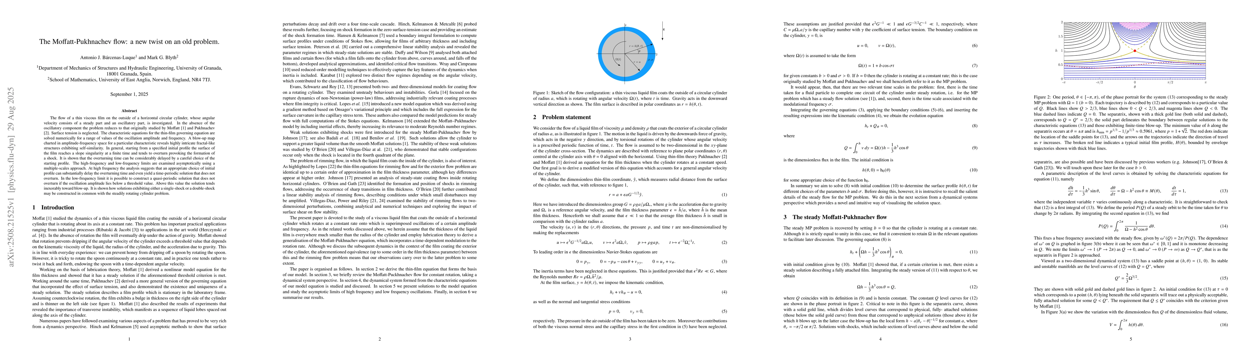 The flow of a thin viscous film on the outside of a horizontal circular cylinder, whose angular velocity is time-periodic with specified frequency and amplitude, is investigated. The constant angular velocity problem was originally studied by Moffatt (1977) and Pukhnachev (1977). Surface tension is neglected. The evolution equation for the film thickness is solved numerically for a range of oscillation amplitudes and frequency. A blow-up map charted in amplitude-frequency space reveals highly intricate fractal-like structures exhibiting self-similarity. For a general initial condition the film surface reaches a slope singularity at a finite time and tends to overturn. The high-frequency and low-frequency limits are examined asymptotically using a multiple-scales approach. At high frequency the analysis suggests that an appropriate choice of initial profile can substantially delay the overturning time, and even yield a time-periodic solution. In the low-frequency limit it is possible to construct a quasi-periodic solution that does not overturn if the oscillation amplitude lies below a threshold value. Above this value the solution tends inexorably toward blow-up. It is shown how solutions exhibiting either a single-shock or a double-shock may be constructed in common with the steadily rotating cylinder problem.