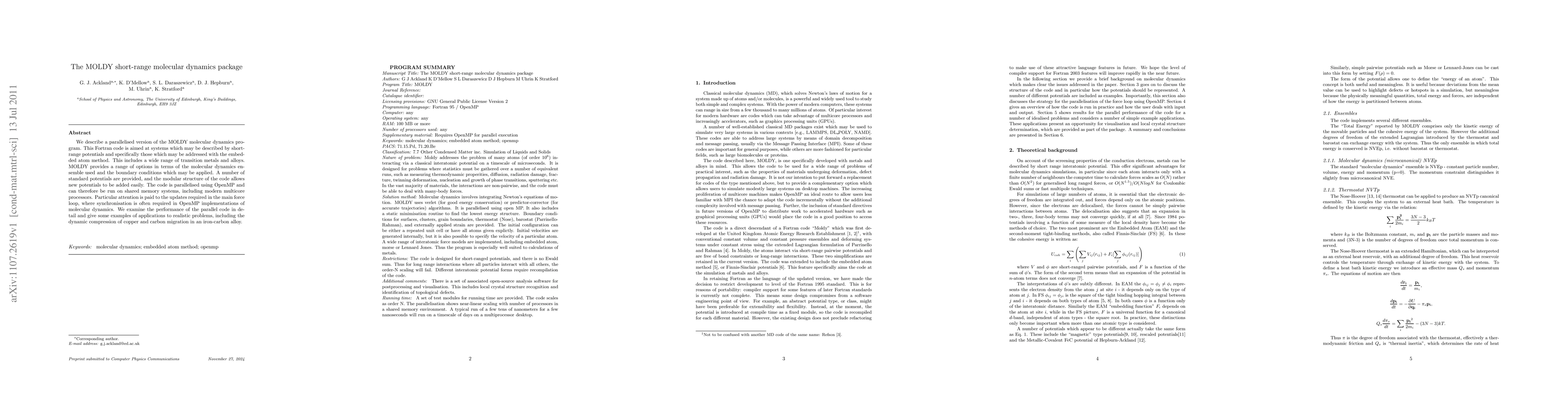 The MOLDY short-range molecular dynamics package is a parallelised Fortran code optimized for systems described by short-range potentials, particularly those addressed by the embedded atom method. It is designed to run efficiently on modern multicore processors using OpenMP and includes various molecular dynamics ensembles and boundary conditions.