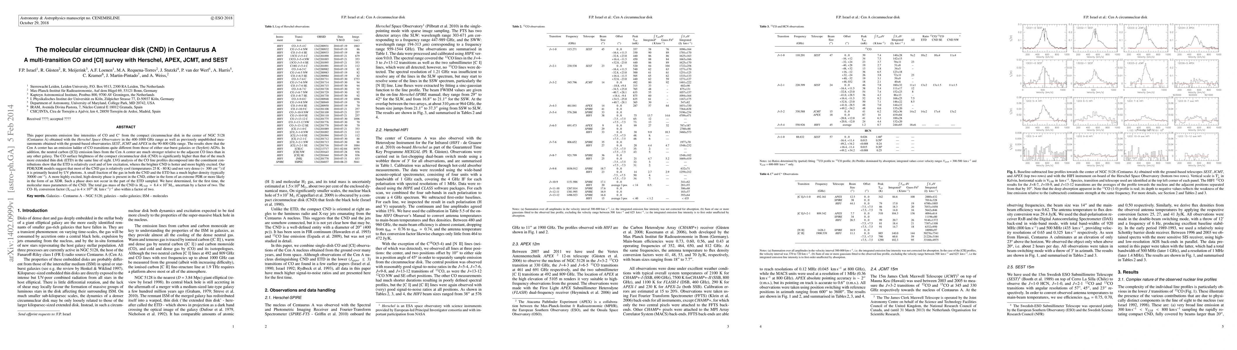 We present new CO and C^o line measurements of the compact circumnuclear disk in the center of NGC 128 (Centaurus~A) obtained with the Herschel Space Observatory, as well as SEST, JCMT, and APEX. The Cen A center CO ladder is quite different from those of either star-burst galaxies or AGNs. In addition, the relative intensity of the central Cen A [CI] emission lines is much greate than that in any other galaxy. The CO surface brightness of the compact circumnuclear disk (CND) is significantly higher than that of the much more extended thin disk (ETD) in the same line of sight. Our LVG and PDR/XDR models suggest that much of the CND gas is relatively cool (25 - 80 K) and not very dense (~ 300 cm^{-3}) if the heating is by UV photons, although there is some gas in both the CND and the ETD with a much higher density of ~30 000 cm^{-3}. Finally, there is also high-excitation, high-density phase in the CND (but not in the ETD), either in the form of an extreme PDR but more likely in the form of an XDR. The total gas mass of the Cen A CND is 8.4 x 10^{7} M(sun), uncertain by a factor of two. The CO-H2 conversion factor is 4 x 10^{20} K km/s, also within a factor of two.