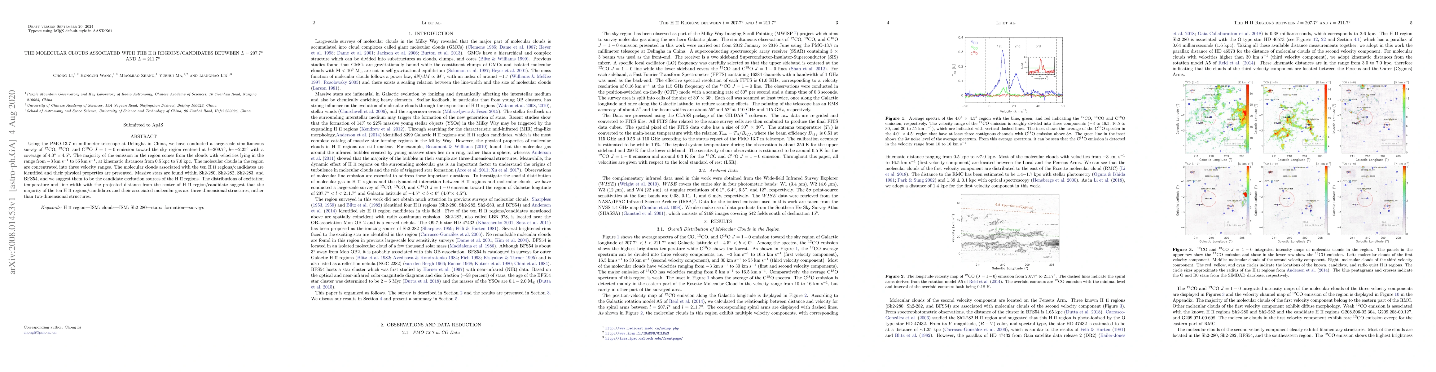 This study uses a millimeter telescope to survey molecular clouds in the region between $l=207.7^\circ$ and $l=211.7^\circ$, identifying ten H II regions/candidates and their associated molecular clouds. The majority of the emission originates from clouds with velocities ranging from $-$3 km s$^{-1}$ to 55 km s$^{-1}$ and distances from 0.5 kpc to 7.0 kpc, suggesting these clouds are three-dimensional structures.