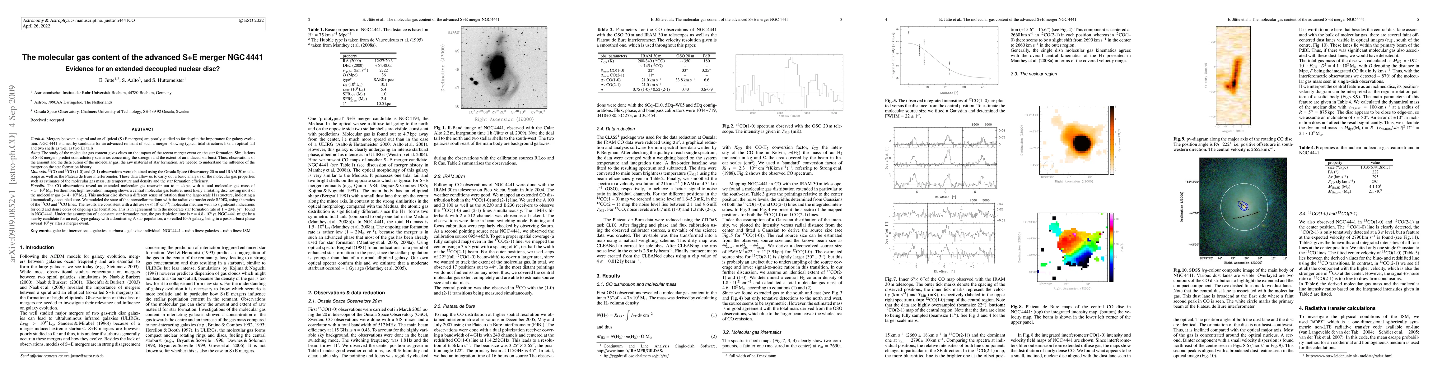 Mergers between a spiral and an elliptical (S+E mergers) are poorly studied so far despite the importance for galaxy evolution. NGC4441 is a nearby candidate for an advanced remnant of such a merger, showing typical tidal structures like an optical tail and two shells as well as two HI tails. The study of the molecular gas content gives clues on the impact of the recent merger event on the star formation. Simulations of S+E mergers predict contradictory scenarios concerning the strength and the extent of an induced starburst. Thus, observations of the amount and the distribution of the molecular gas, the raw material of star formation, are needed to understand the influence of the merger on the star formation history. 12CO and 13CO (1-0) and (2-1) observations were obtained using the Onsala Space Observatory 20m and IRAM 30m telescope as well as the Plateau de Bure interferometer. These data allow us to carry out a basic analysis of the molecular gas properties such as estimates of the molecular gas mass, its temperature and density and the star formation efficiency. The CO observations reveal an extended molecular gas reservoir out to ~4kpc, with a total molecular gas mass of ~5x10^8 M_sun. Furthermore, high resolution imaging shows a central molecular gas feature, most likely a rotating disc hosting most of the molecular gas ~4x10^8 M_sun. This nuclear disc shows a different sense of rotation than the large-scale HI structure, indicating a kinematically decoupled core. (abbreviated)