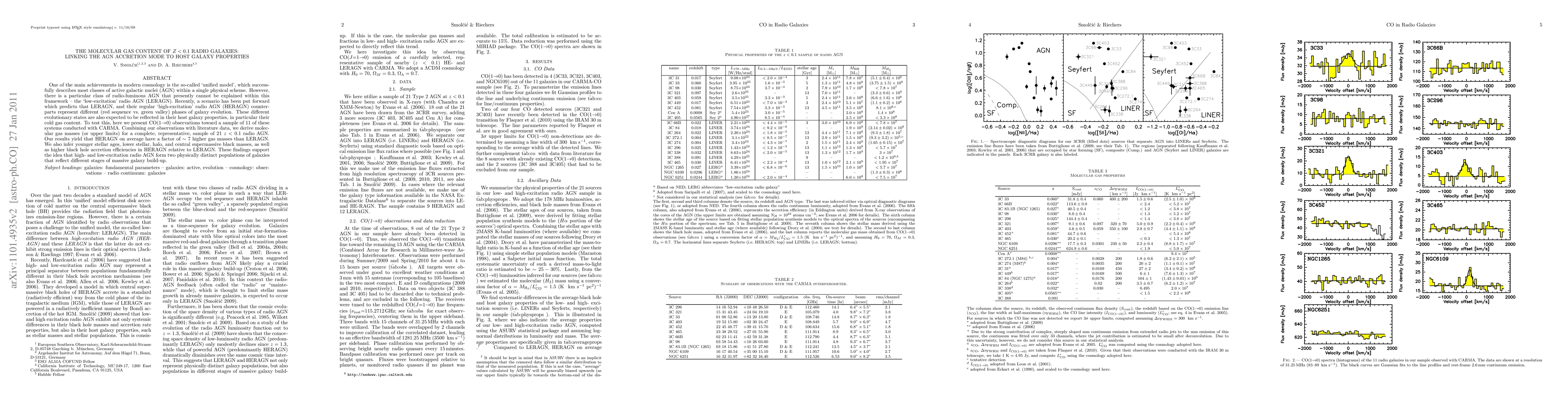 One of the main achievements in modern cosmology is the so-called `unified model', which successfully describes most classes of active galactic nuclei (AGN) within a single physical scheme. However, there is a particular class of radio-luminous AGN that presently cannot be explained within this framework -- the `low-excitation' radio AGN (LERAGN). Recently, a scenario has been put forward which predicts that LERAGN, and their regular `high-excitation' radio AGN (HERAGN) counterparts represent different (red sequence vs. green valley) phases of galaxy evolution. These different evolutionary states are also expected to be reflected in their host galaxy properties, in particular their cold gas content. To test this, here we present CO(1-0) observations toward a sample of 11 of these systems conducted with CARMA. Combining our observations with literature data, we derive molecular gas masses (or upper limits) for a complete, representative, sample of 21 z<0.1 radio AGN. Our results yield that HERAGN on average have a factor of ~7 higher gas masses than LERAGN. We also infer younger stellar ages, lower stellar, halo, and central supermassive black masses, as well as higher black hole accretion efficiencies in HERAGN relative to LERAGN. These findings support the idea that high- and low-excitation radio AGN form two physically distinct populations of galaxies that reflect different stages of massive galaxy build-up.
