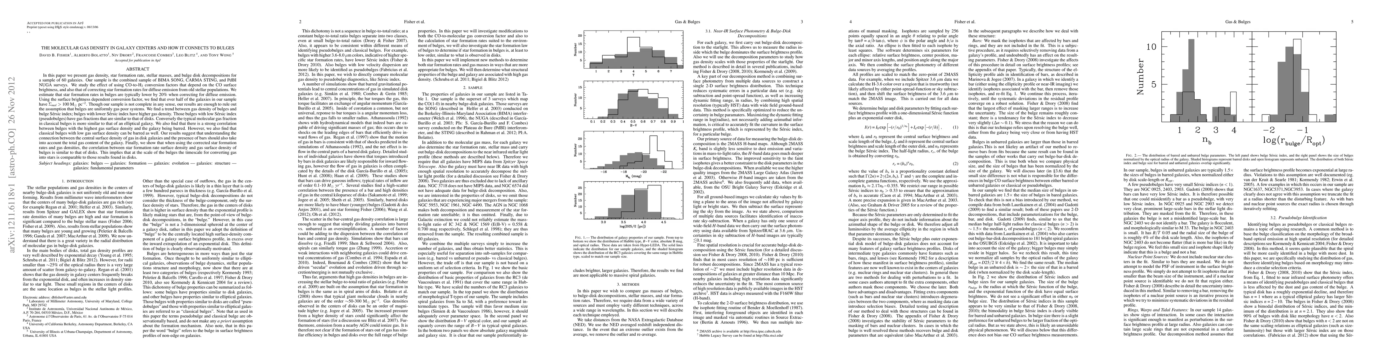 In this paper we present gas density, star formation rate, stellar masses, and bulge disk decompositions for a sample of 60 galaxies. Our sample is the combined sample of BIMA SONG, CARMA STING, and PdBI NUGA surveys. We study the effect of using CO-to-H_2 conversion factors that depend on the CO surface brightness, and also that of correcting star formation rates for diffuse emission from old stellar populations. We estimate that star formation rates in bulges are typically lower by 20% when correcting for diffuse emission. We find that over half of the galaxies in our sample have molecular gas surface density >100 M_sun pc^-2. We find a trend between gas density of bulges and bulge Sersic index; bulges with lower Sersic index have higher gas density. Those bulges with low Sersic index (pseudobulges) have gas fractions that are similar to that of disks. We also find that there is a strong correlation between bulges with the highest gas surface density and the galaxy being barred. However, we also find that classical bulges with low gas surface density can be barred as well. Our results suggest that understanding the connection between the central surface density of gas in disk galaxies and the presence of bars should also take into account the total gas content of the galaxy and/or bulge Sersic index. Indeed, we find that high bulge Sersic index is the best predictor of low gas density inside the bulge (not barredness of the disk). Finally, we show that when using the corrected star formation rates and gas densities, the correlation between star formation rate surface density and gas surface density of bulges is similar to that of disks.