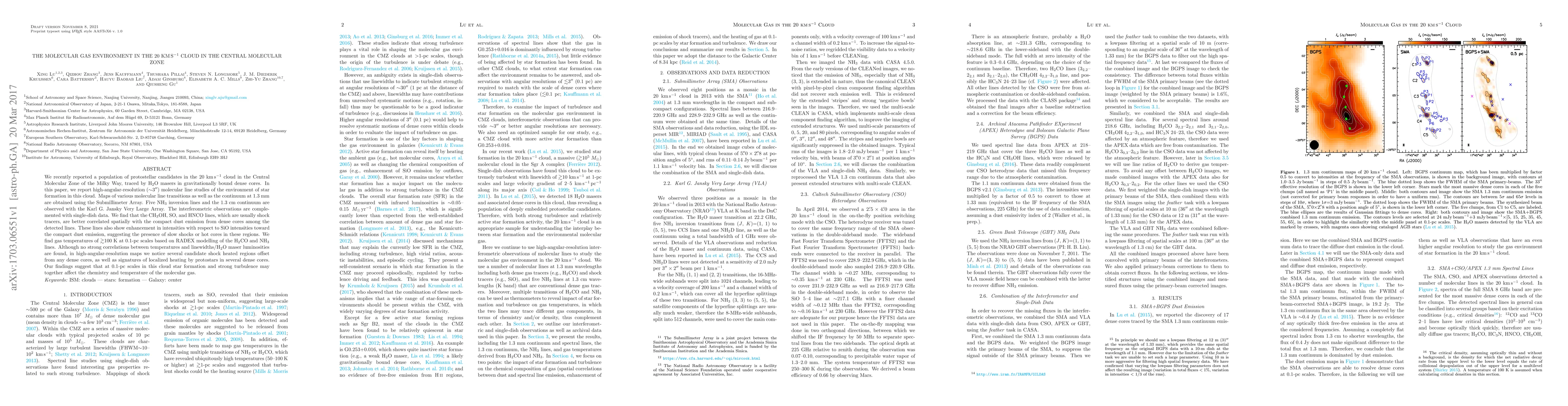 The study uses high-angular-resolution observations to investigate the molecular gas environment in a 20 km s$^{-1}$ cloud in the Central Molecular Zone of the Milky Way, finding evidence of slow shocks, hot cores, and localized heating by protostars.