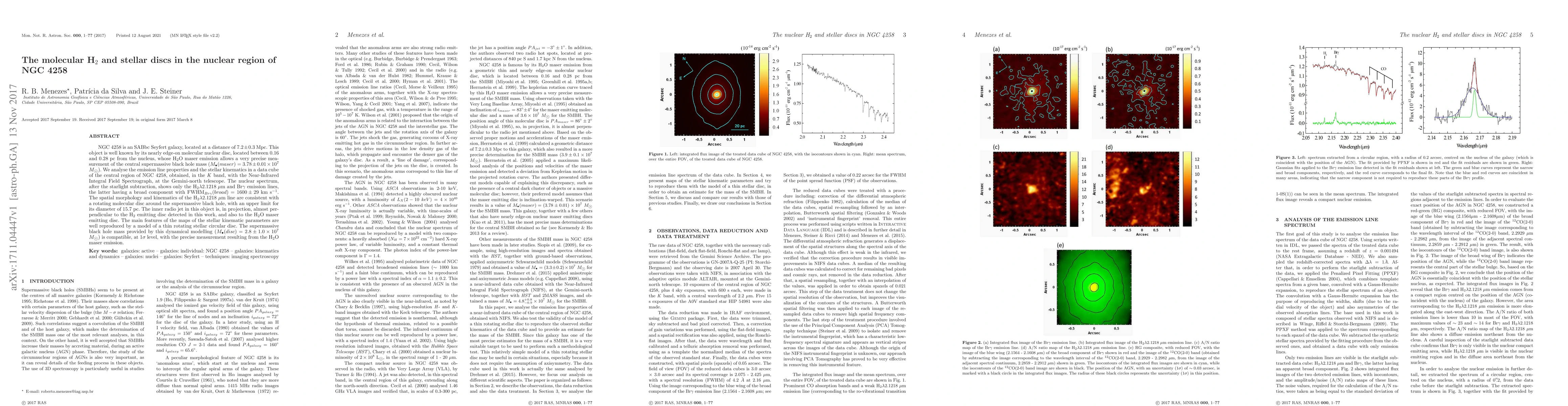 NGC 4258 is an SABbc Seyfert galaxy, located at a distance of $7.2 \pm 0.3$ Mpc. This object is well known by its nearly edge-on molecular nuclear disc, located between 0.16 and 0.28 pc from the nucleus, whose H$_2$O maser emission allows a very precise measurement of the central supermassive black hole mass ($M_{\bullet}(maser) = 3.78 \pm 0.01 \times 10^7$ Mo). We analyse the emission line properties and the stellar kinematics in a data cube of the central region of NGC 4258, obtained, in the K band, with the Near-Infrared Integral Field Spectrograph, at the Gemini-north telescope. The nuclear spectrum, after the starlight subtraction, shows only the H$_2 \lambda 2.1218$ $\mu$m and Br$\gamma$ emission lines, the latter having a broad component with FWHM$_{Br\gamma}(broad) = 1600 \pm 29$ km s$^{-1}$. The spatial morphology and kinematics of the H$_2 \lambda 2.1218$ $\mu$m line are consistent with a rotating molecular disc around the supermassive black hole, with an upper limit for its diameter of 15.7 pc. The inner radio jet in this object is, in projection, almost perpendicular to the H$_2$ emitting disc detected in this work, and also to the H$_2$O maser emitting disc. The main features of the maps of the stellar kinematic parameters are well reproduced by a model of a thin rotating stellar circular disc. The supermassive black hole mass provided by this dynamical modelling ($M_{\bullet}(disc) = 2.8 \pm 1.0 \times 10^7$ Mo) is compatible, at 1$\sigma$ level, with the precise measurement resulting from the H$_2$O maser emission.