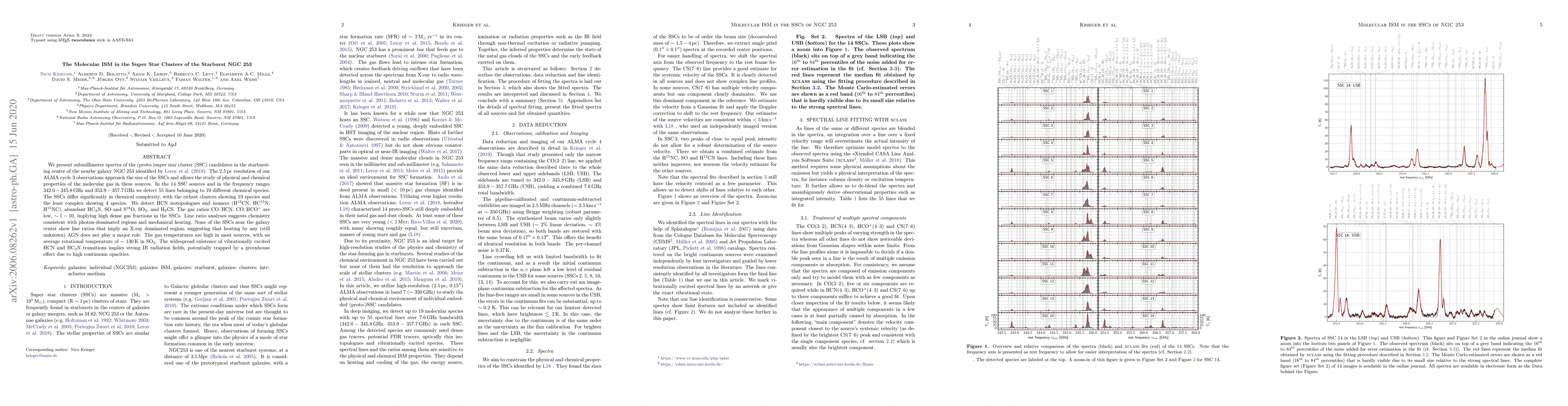 This paper uses ALMA observations to study the molecular ISM in super star clusters within the starburst galaxy NGC 253, detecting 55 lines from 19 chemical species. The clusters show varying chemical complexity, with high dense gas fractions and gas temperatures averaging around 130 K, suggesting strong IR radiation fields and potential greenhouse effects.