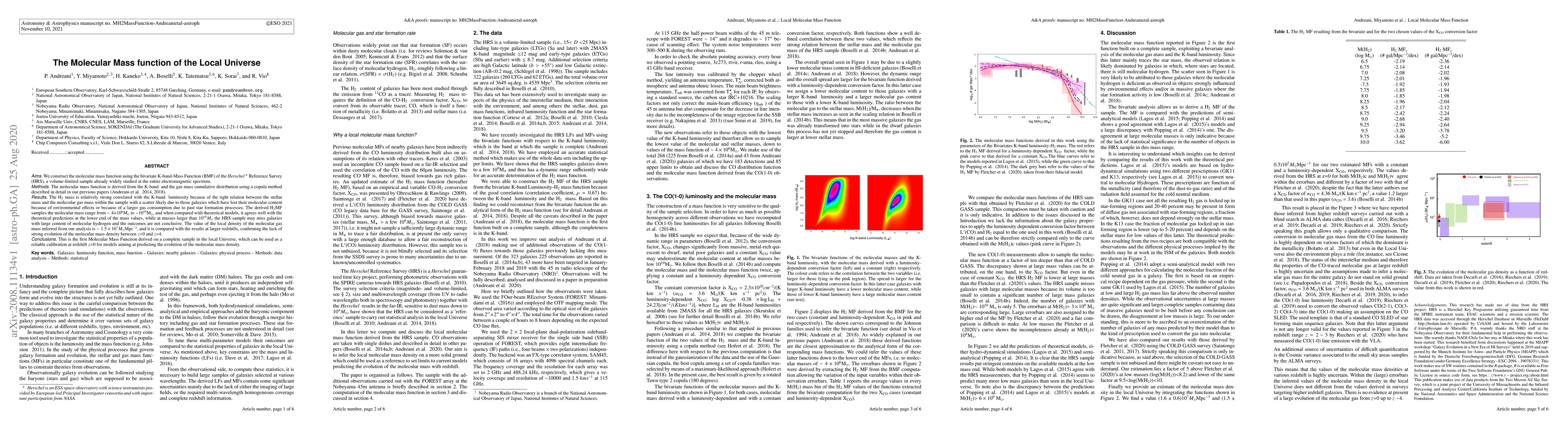 This paper constructs the first molecular mass function for the local Universe using the Herschel Reference Survey's K-band luminosity and gas mass data. The derived H2 mass function, spanning from 4 x 10^6 to 10^10 solar masses, aligns well with theoretical models at lower masses but lacks conclusive results for higher masses.
