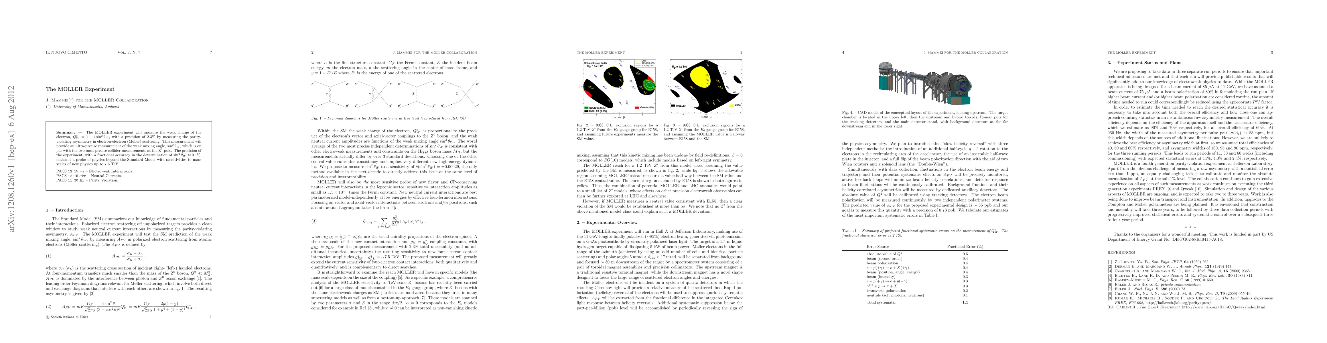 The MOLLER experiment will measure the weak charge of the electron, $Q^e_W = 1 - 4\sin^2\theta_W$, with a precision of 2.3% by measuring the parity-violating asymmetry in electron-electron (M\oller) scattering. This measurement will provide an ultra-precise measurement of the weak mixing angle, $\sin^2\theta_W$, which is on par with the two most precise collider measurements at the Z$^0$-pole. The precision of the experiment, with a fractional accuracy in the determination of $\sin^2\theta_W$ $\approx 0.1$%, makes it a probe of physics beyond the Standard Model with sensitivities to mass scales of new physics up to 7.5 TeV.