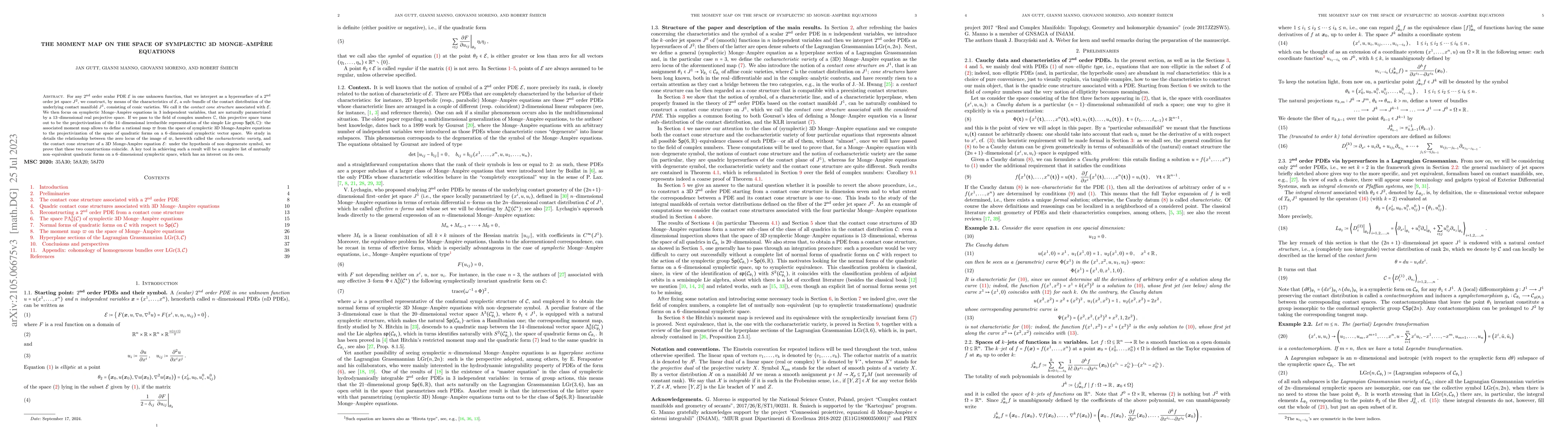 For any second-order scalar PDE $\mathcal{E}$ in one unknown function, that we interpret as a hypersurface of a second-order jet space $J^2$, we construct, by means of the characteristics of $\mathcal{E}$, a sub-bundle of the contact distribution of the underlying contact manifold $J^1$, consisting of conic varieties. We call it the contact cone structure associated with $\mathcal{E}$. We then focus on symplectic Monge-Amp\`ere equations in 3 independent variables, that are naturally parametrized by a 13-dimensional real projective space. If we pass to the field of complex numbers $\mathbb{C}$, this projective space turns out to be the projectivization of the 14-dimensional irreducible representation of the simple Lie group $\mathsf{Sp}(6,\mathbb{C})$: the associated moment map allows to define a rational map $\varpi$ from the space of symplectic 3D Monge-Amp\`ere equations to the projectivization of the space of quadratic forms on a $6$-dimensional symplectic vector space. We study in details the relationship between the zero locus of the image of $\varpi$, herewith called the cocharacteristic variety, and the contact cone structure of a 3D Monge-Amp\`ere equation $\mathcal{E}$: under the hypothesis of non-degenerate symbol, we prove that these two constructions coincide. A key tool in achieving such a result will be a complete list of mutually non-equivalent quadratic forms on a $6$-dimensional symplectic space, which has an interest on its own.