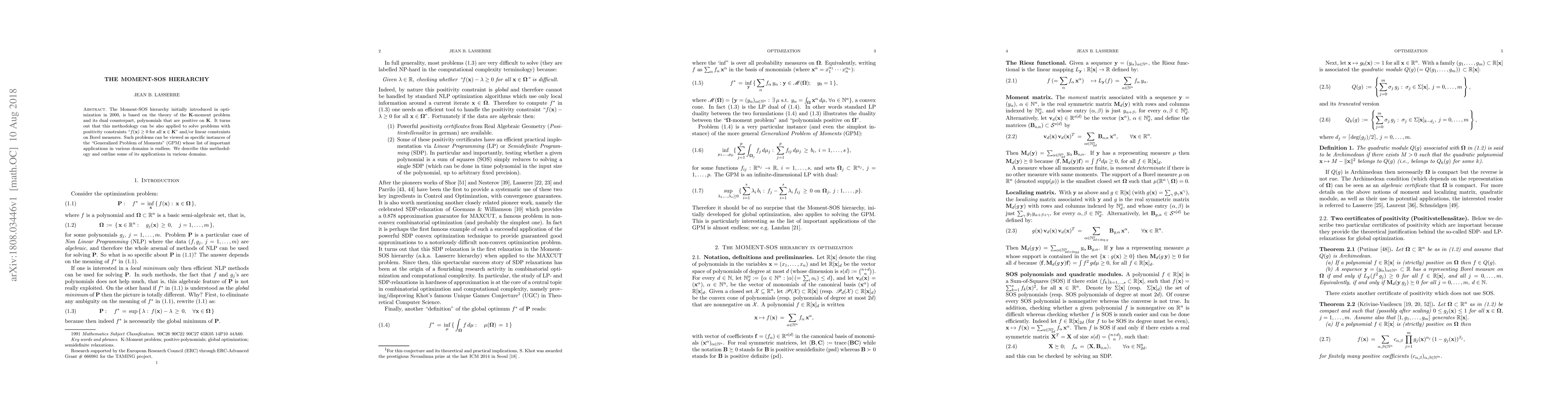 The Moment-SOS hierarchy, based on the K-moment problem, provides a methodology for solving optimization problems with positivity and linear constraints on Borel measures, applicable to the Generalized Problem of Moments across diverse domains. This approach outlines its utility and applications in various fields.