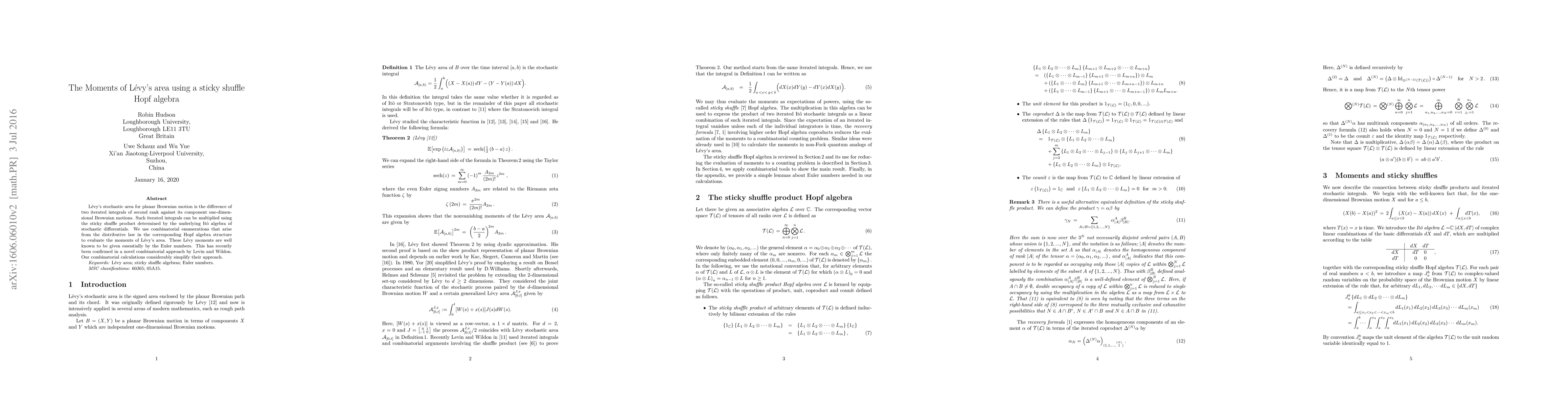 This paper evaluates the moments of L\'evy's area using a sticky shuffle Hopf algebra, showing that these moments are essentially given by Euler numbers. The authors simplify the combinatorial approach previously used by Levin and Wildon through their novel use of combinatorial enumerations from the Hopf algebra structure.