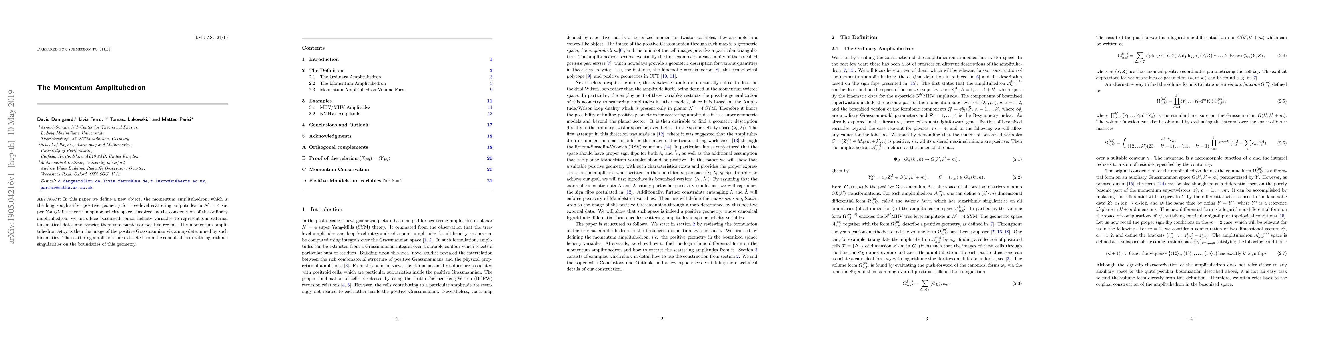 The paper introduces the momentum amplituhedron, a new geometric object representing the positive region for tree-level scattering amplitudes in $\mathcal{N}=4$ super Yang-Mills theory. The scattering amplitudes are derived from this geometry, which is defined via bosonized spinor helicity variables and related to the positive Grassmannian.