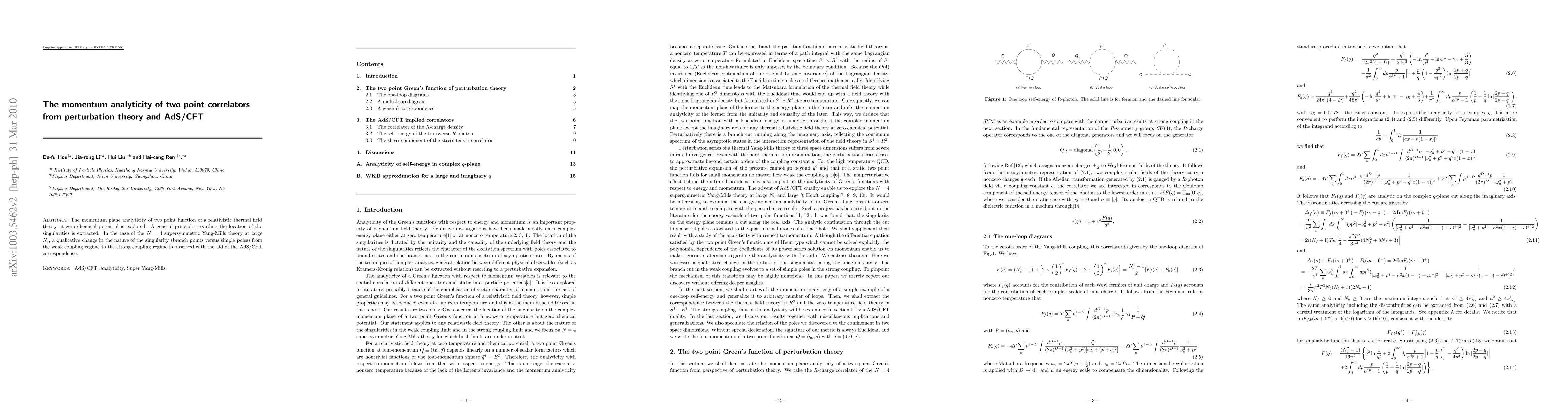 This paper investigates the momentum plane analyticity of two-point correlators in relativistic thermal field theory, revealing a general principle for singularity locations. It observes a shift from branch points to simple poles in the N=4 supersymmetric Yang-Mills theory's singularities, transitioning from weak to strong coupling via the AdS/CFT correspondence.