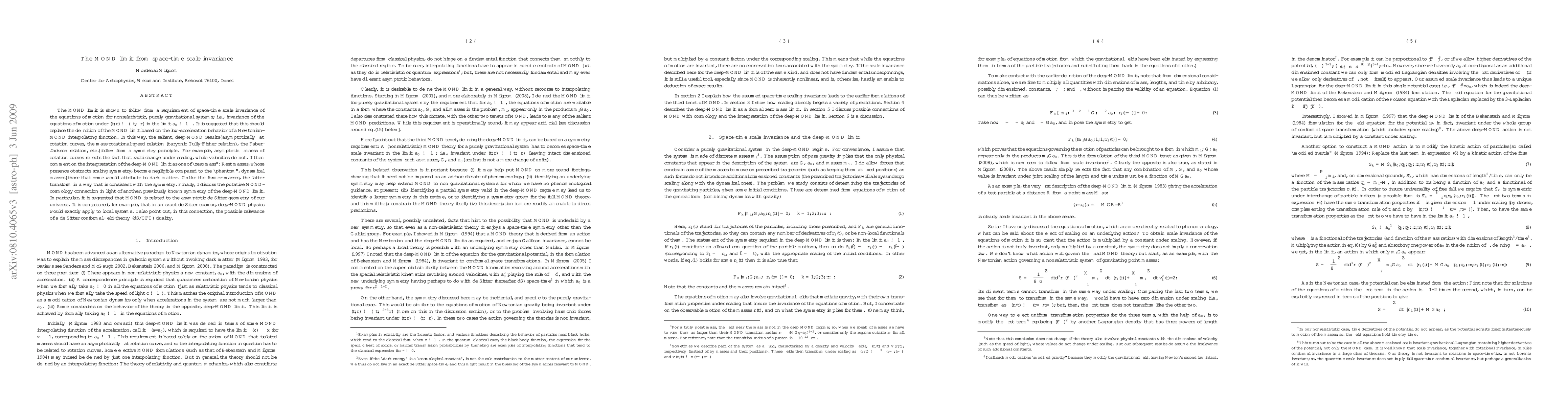 The MOND limit is shown to follow from a requirement of space-time scale invariance of the equations of motion for nonrelativistic, purely gravitational systems; i.e., invariance of the equations of motion under (t,r) goes to (qt,qr), in the limit a0 goes to infinity. It is suggested that this should replace the definition of the MOND limit based on the low-acceleration behavior of a Newtonian-MOND interpolating function. In this way, the salient, deep-MOND results--asymptotically flat rotation curves, the mass-rotational-speed relation (baryonic Tully-Fisher relation), the Faber-Jackson relation, etc.--follow from a symmetry principle. For example, asymptotic flatness of rotation curves reflects the fact that radii change under scaling, while velocities do not. I then comment on the interpretation of the deep-MOND limit as one of "zero mass": Rest masses, whose presence obstructs scaling symmetry, become negligible compared to the "phantom", dynamical masses--those that some would attribute to dark matter. Unlike the former masses, the latter transform in a way that is consistent with the symmetry. Finally, I discuss the putative MOND-cosmology connection in light of another, previously known symmetry of the deep-MOND limit. In particular, it is suggested that MOND is related to the asymptotic de Sitter geometry of our universe. It is conjectured, for example, that in an exact de Sitter cosmos, deep-MOND physics would exactly apply to local systems. I also point out, in this connection, the possible relevance of a de Sitter-conformal-field-theory (dS/CFT) duality.