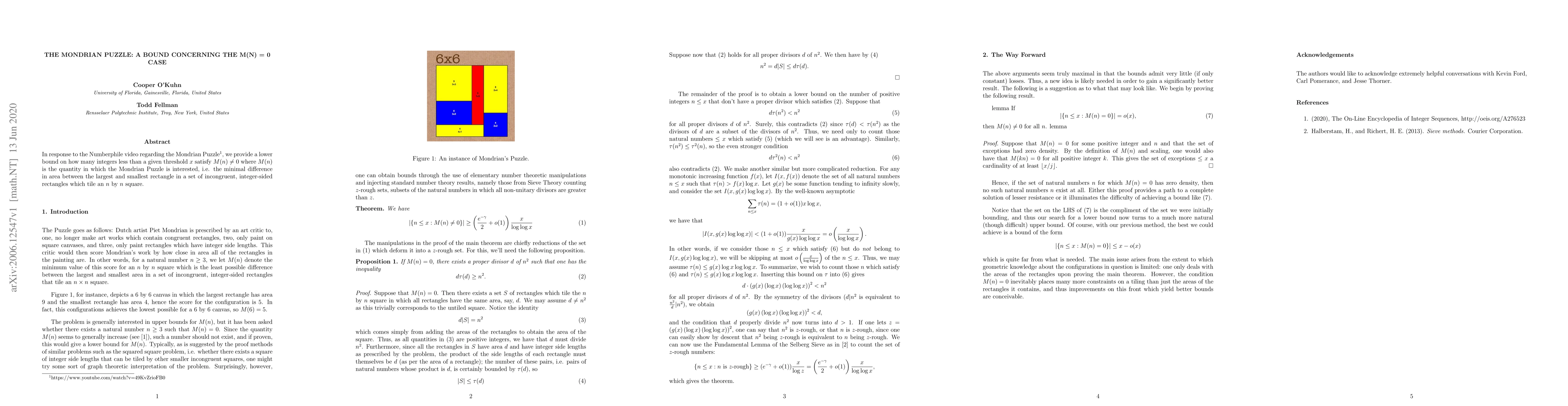 This paper provides a lower bound on the number of integers less than a threshold that satisfy a specific condition related to the Mondrian Puzzle, a mathematical problem about tiling rectangles in a square.