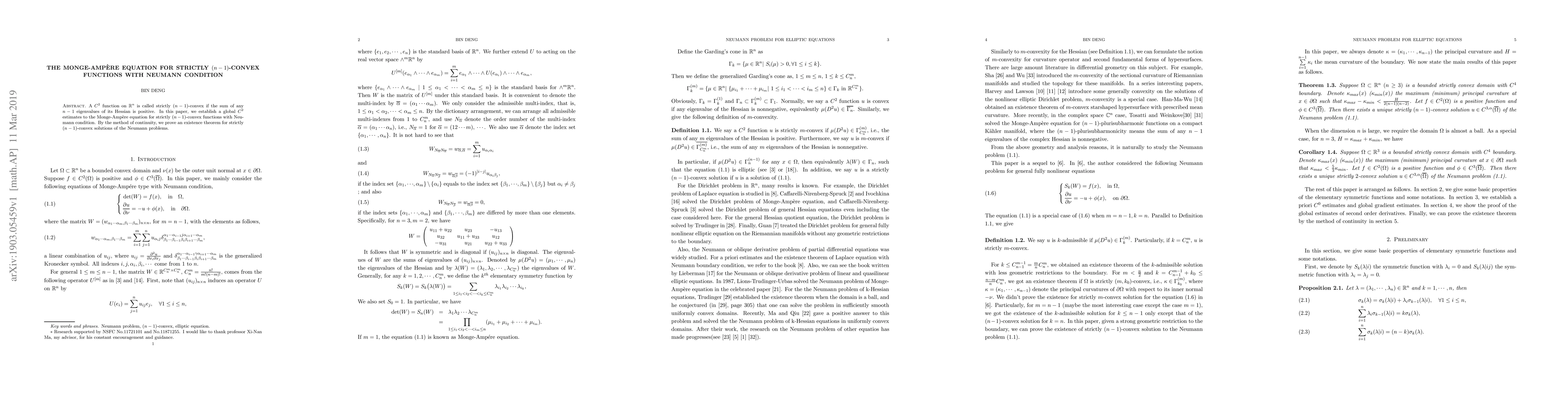 A $C^2$ function on $\mathbb{R}^n$ is called strictly $(n-1)$-convex if the sum of any $n-1$ eigenvalues of its Hessian is positive. In this paper, we establish a global $C^2$ estimates to the Monge-Amp\`ere equation for strictly $(n-1)$-convex functions with Neumann condition. By the method of continuity, we prove an existence theorem for strictly $(n-1)$-convex solutions of the Neumann problems.