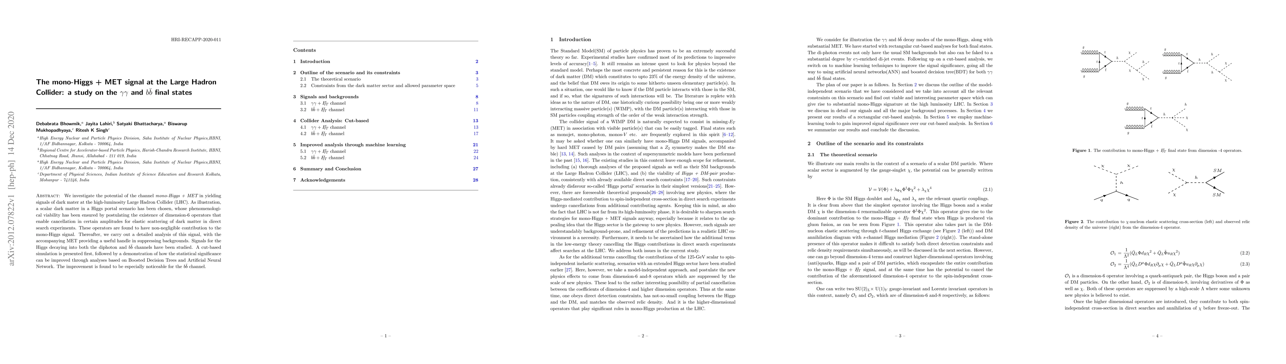 We investigate the potential of the channel {\em mono-Higgs + MET} in yielding signals of dark mater at the high-luminosity Large Hadron Collider (LHC). As illustration, a scalar dark matter in a Higgs portal scenario has been chosen, whose phenomenological viability has been ensured by postulating the existence of dimension-6 operators that enable cancellation in certain amplitudes for elastic scattering of dark matter in direct search experiments. These operators are found to have non-negligible contribution to the mono-Higgs signal. Thereafter, we carry out a detailed analysis of this signal, with the accompanying MET providing a useful handle in suppressing backgrounds. Signals for the Higgs decaying into both the diphoton and $b{\bar b}$ channels have been studied. A cut-based simulation is presented first, followed by a demonstration of how the statistical significance can be improved through analyses based on Boosted Decision Trees and Artificial Neural Network. The improvement is found to be especially noticeable for the $b{\bar b}$ channel.
