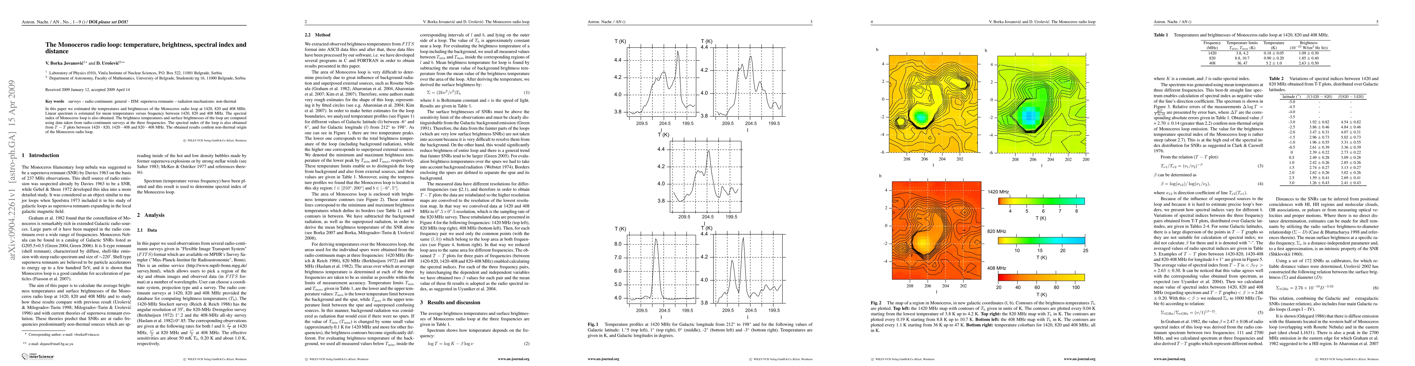 This paper estimates the temperatures, brightnesses, and spectral index of the Monoceros radio loop across three frequencies, confirming its non-thermal origin through spectral analysis and $T-T$ plots. The study utilizes radio-continuum survey data to derive these properties.