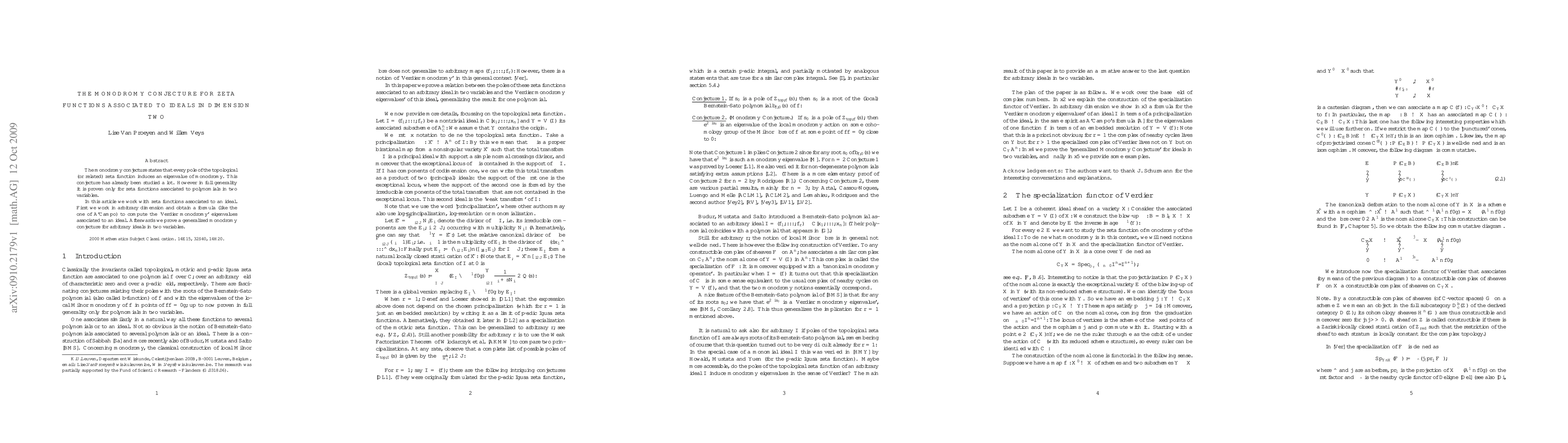 This paper proves a generalized version of the monodromy conjecture for zeta functions associated with ideals in two dimensions, extending the existing results that only covered polynomial cases. It also provides a formula to compute the 'Verdier monodromy' eigenvalues for ideals in any dimension.