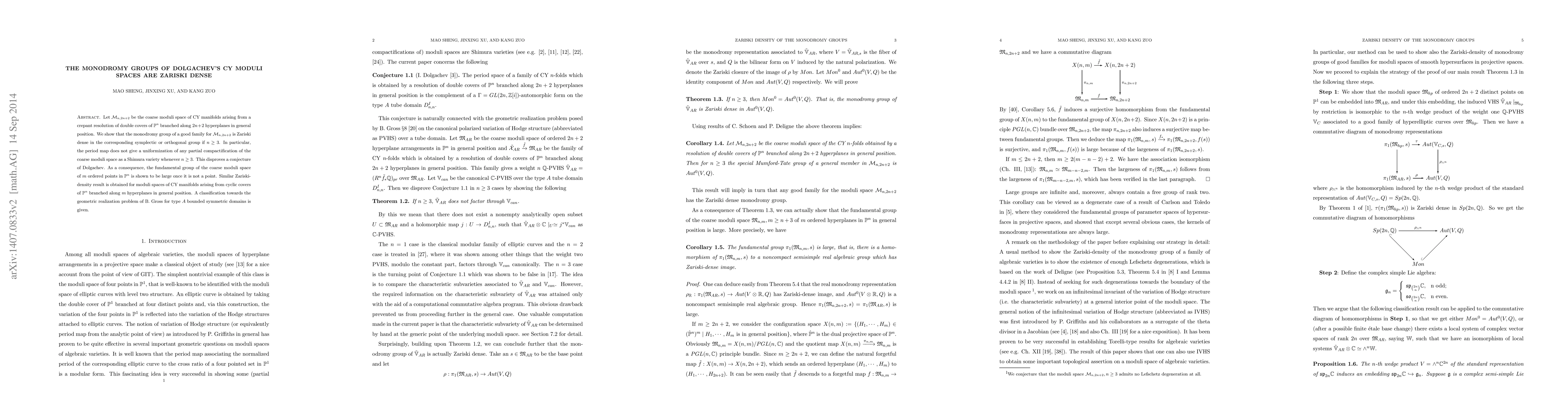Let $\mathcal{M}_{n,2n+2}$ be the coarse moduli space of CY manifolds arising from a crepant resolution of double covers of $\mathbb{P}^n$ branched along $2n+2$ hyperplanes in general position. We show that the monodromy group of a good family for $\mathcal{M}_{n,2n+2}$ is Zariski dense in the corresponding symplectic or orthogonal group if $n\geq 3$. In particular, the period map does not give a uniformization of any partial compactification of the coarse moduli space as a Shimura variety whenever $n\geq 3$. This disproves a conjecture of Dolgachev. As a consequence, the fundamental group of the coarse moduli space of $m$ ordered points in $\mathbb{P}^n$ is shown to be large once it is not a point. Similar Zariski-density result is obtained for moduli spaces of CY manifolds arising from cyclic covers of $\mathbb{P}^n$ branched along $m$ hyperplanes in general position. A classification towards the geometric realization problem of B. Gross for type $A$ bounded symmetric domains is given.