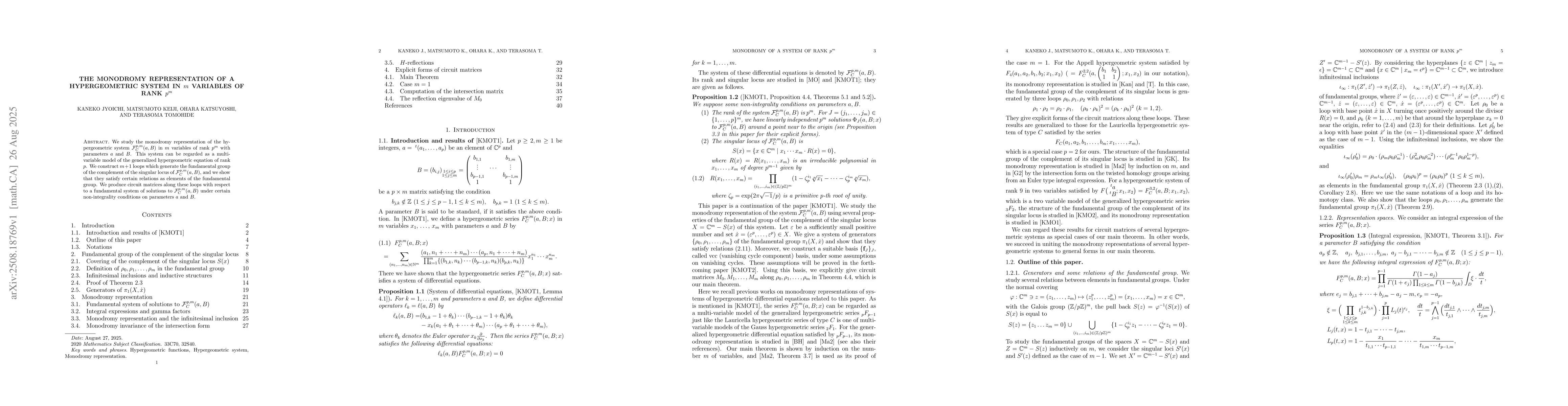 We study the monodromy representation of the hypergeometric system $\mathcal{F}_{C}^{p,m}(a,B)$ in $m$ variables of rank $p^m$ with parameters $a$ and $B$. This system can be regarded as a multi-variable model of the generalized hypergeometric equation of rank $p$. We construct $m+1$ loops which generate the fundamental group of the complement of the singular locus of $\mathcal{F}_{C}^{p,m}(a,B)$, and we show that they satisfy certain relations as elements of the fundamental group. We produce circuit matrices along these loops with respect to a fundamental system of solutions to $\mathcal{F}_C^{p,m}(a,B)$ under certain non-integrality conditions on parameters $a$ and $B$.