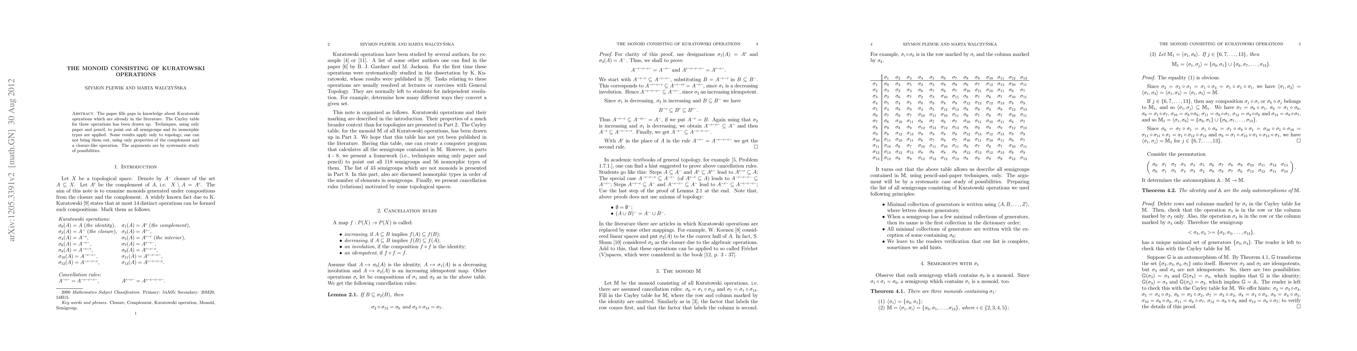 The paper fills gaps in knowledge about Kuratowski operations which are already in the literature. The Cayley table for these operations has been drawn up. Techniques, using only paper and pencil, to point out all semigroups and its isomorphic types are applied. Some results apply only to topology, one can not bring them out, using only properties of the complement and a closure-like operation. The arguments are by systematic study of possibilities.