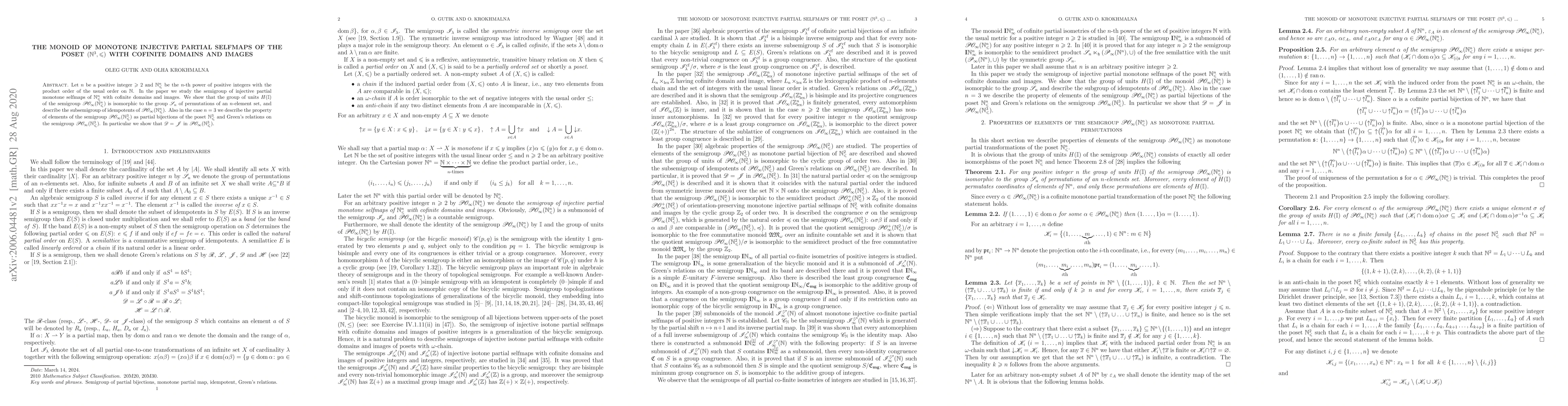 This paper investigates the semigroup of injective partial monotone selfmaps of $(\mathbb{N}^n_{\leqslant}, \leqslant)$ with cofinite domains and images, proving that its group of units is isomorphic to the permutation group $\mathscr{S}_n$. It also describes the subsemigroup of idempotents and Green's relations in the case of $n=3$, showing that $\mathscr{D}$ and $\mathscr{J}$ coincide in this context.