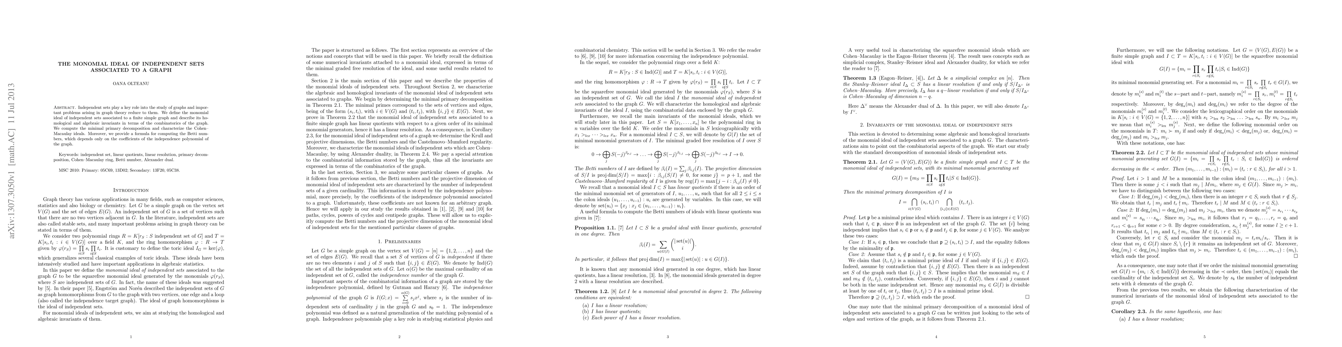 Researchers study how to analyze independent sets in graphs using monomial ideals, providing a formula for Betti numbers based on the independence polynomial.