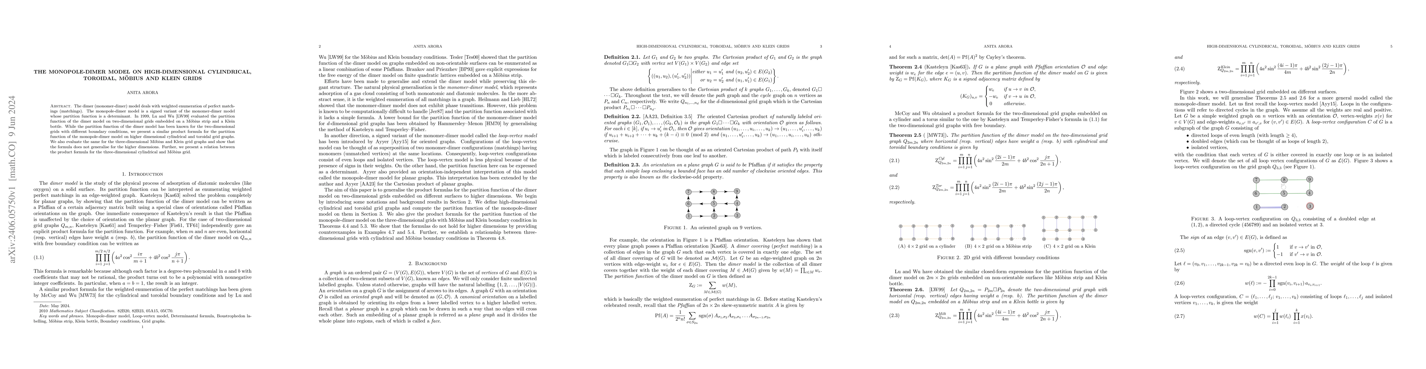 The dimer (monomer-dimer) model deals with weighted enumeration of perfect matchings (matchings). The monopole-dimer model is a signed variant of the monomer-dimer model whose partition function is a determinant. In 1999, Lu and Wu evaluated the partition function of the dimer model on two-dimensional grids embedded on a M\"obius strip and a Klein bottle. While the partition function of the dimer model has been known for the two-dimensional grids with different boundary conditions, we present a similar product formula for the partition function of the monopole-dimer model on higher dimensional cylindrical and toroidal grid graphs. We also evaluate the same for the three-dimensional M\"obius and Klein grid graphs and show that the formula does not generalise for the higher dimensions. Further, we present a relation between the product formula for the three-dimensional cylindrical and M\"obius grid.