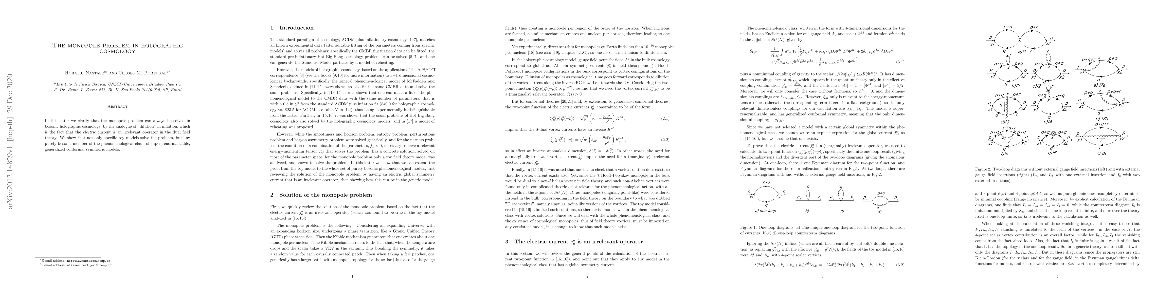 In this letter we clarify that the monopole problem can always be solved in bosonic holographic cosmology, by the analogue of "dilution" in inflation, which is the fact that the {\em electric} current is an irrelevant operator in the dual field theory. We show that not only specific toy models solve the problem, but any purely bosonic member of the phenomenological class, of super-renormalizable, generalized conformal symmetric models.