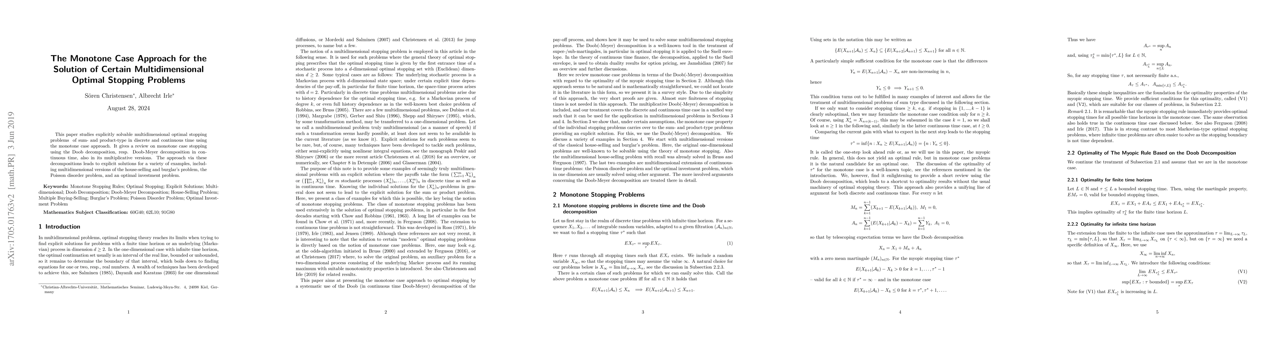 This paper solves multidimensional optimal stopping problems using the monotone case approach, providing explicit solutions for various examples including house-selling and burglar's problem.