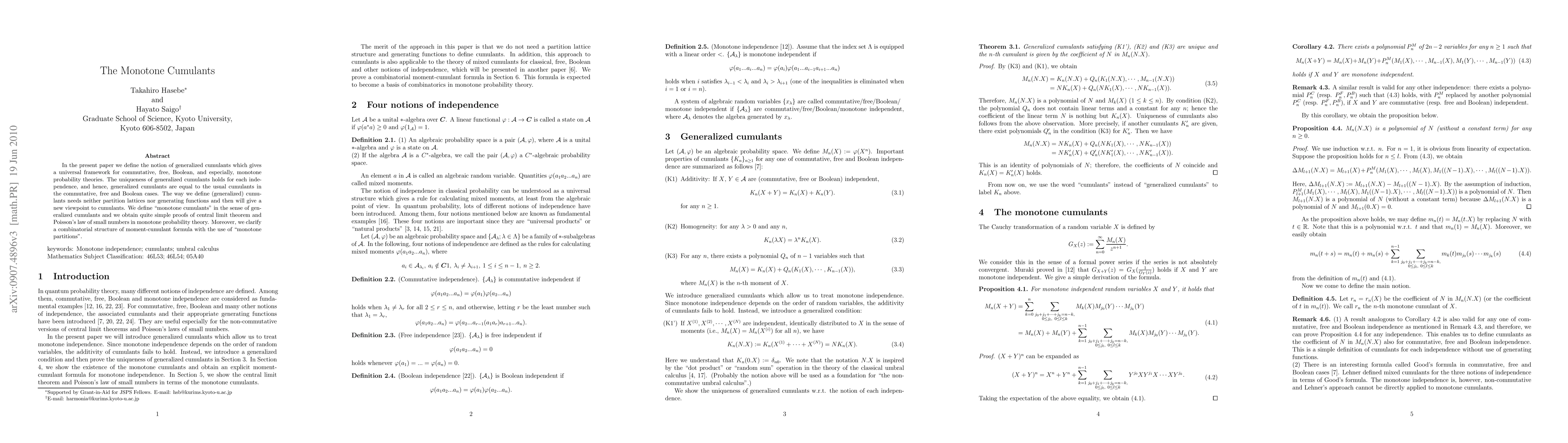 This paper introduces generalized cumulants providing a unified framework for various probability theories, including monotone probability. It simplifies the definition of cumulants and offers straightforward proofs for the central limit theorem and Poisson's law in monotone probability, utilizing a new combinatorial structure based on "monotone partitions."