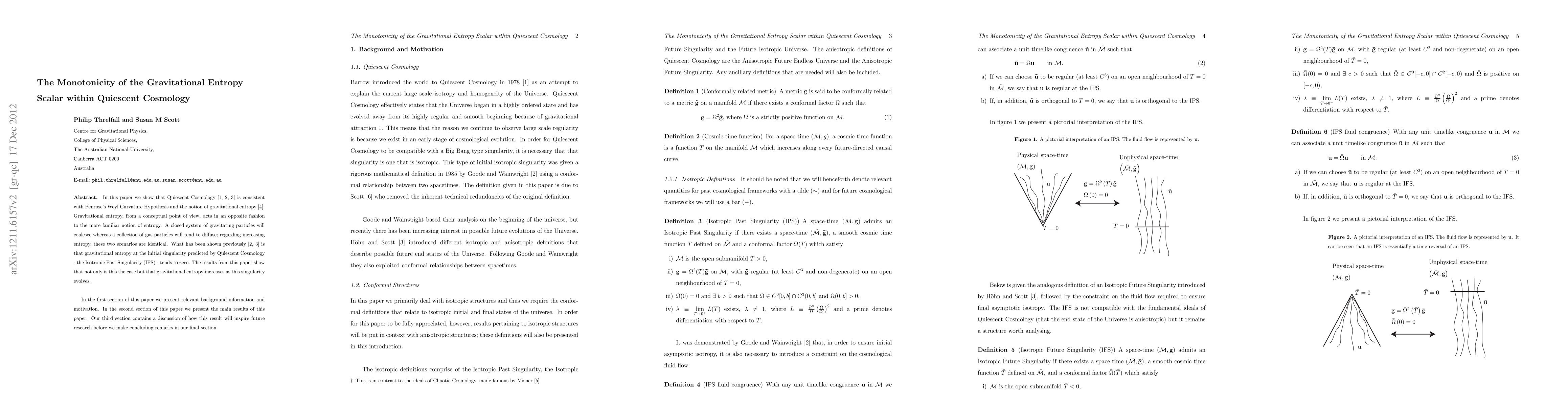 In this paper we show that Quiescent Cosmology [1, 2, 3] is consistent with Penrose's Weyl Curvature Hypothesis and the notion of gravitational entropy [4]. Gravitational entropy, from a conceptual point of view, acts in an opposite fashion to the more familiar notion of entropy. A closed system of gravitating particles will coalesce whereas a collection of gas particles will tend to diffuse; regarding increasing entropy, these two scenarios are identical. What has been shown previously [2, 3] is that gravitational entropy at the initial singularity predicted by Quiescent Cosmology - the Isotropic Past Singularity (IPS) - tends to zero. The results from this paper show that not only is this the case but that gravitational entropy increases as this singularity evolves. In the first section of this paper we present relevant background information and motivation. In the second section of this paper we present the main results of this paper. Our third section contains a discussion of how this result will inspire future research before we make concluding remarks in our final section.