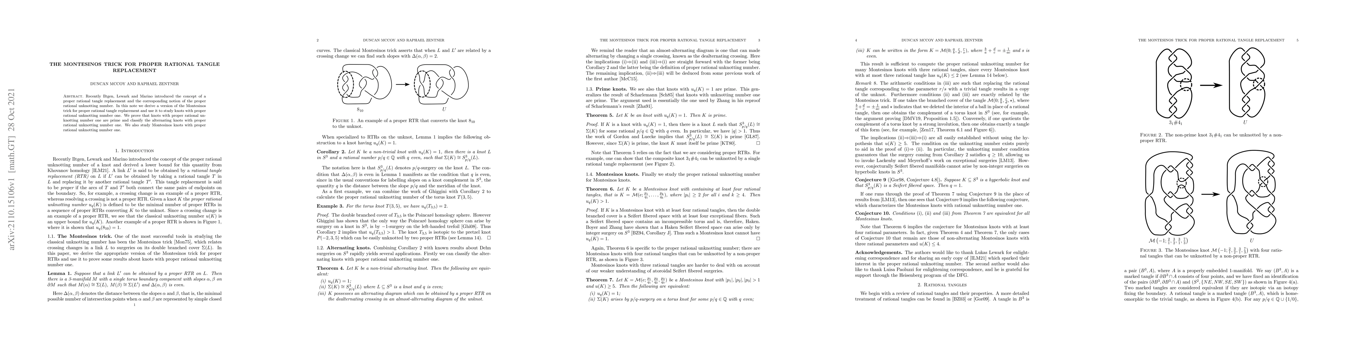 This paper presents a Montesinos trick for proper rational tangle replacement and utilizes it to investigate knots with a proper rational unknotting number of one, proving that such knots are prime and classifying alternating knots in this category, while also exploring Montesinos knots with similar properties.