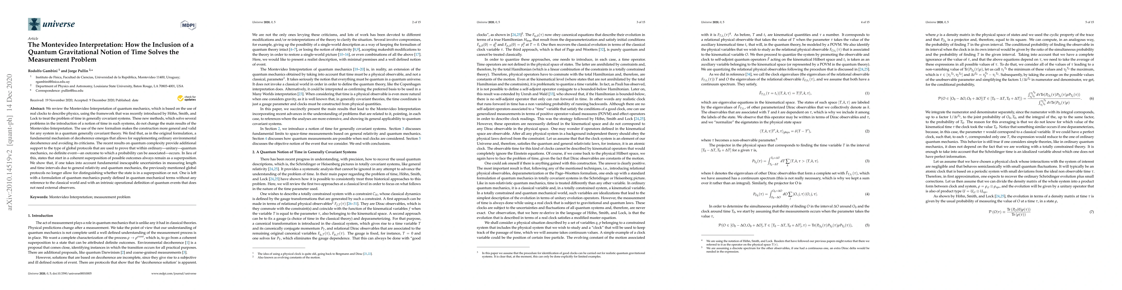 The Montevideo Interpretation of quantum mechanics incorporates real clocks to address the measurement problem, utilizing a new formalism to treat time in generally covariant systems. This approach resolves the measurement problem by introducing a fundamental mechanism of decoherence, supported by recent results on quantum complexity, and redefines quantum events intrinsically without external observers.