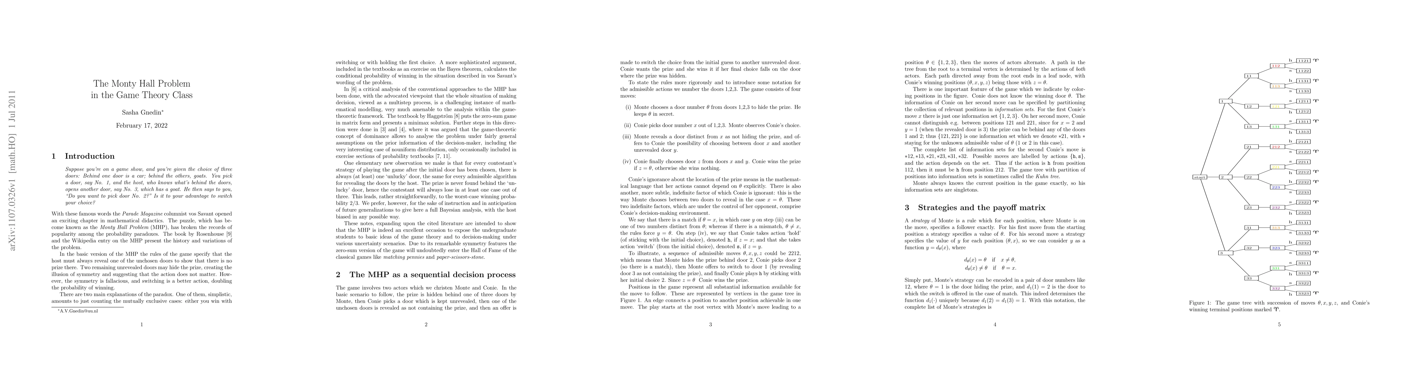 This paper analyzes the Monty Hall problem from a game theory perspective, providing a Bayesian and noncooperative game-theoretic solution to the classic problem. It finds that switching doors provides the best expected outcome over sticking with the initial choice.