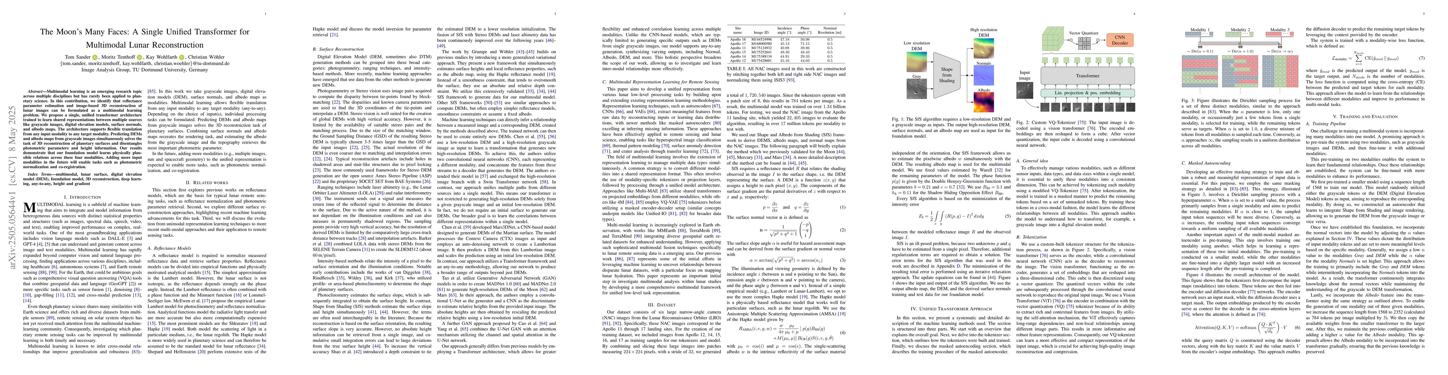 This work stands out by applying multimodal learning to planetary science, specifically for lunar data, and proposing a transformer-based architecture that simultaneously predicts DEMs and albedo maps from grayscale images, disentangling photometric parameters and height information.